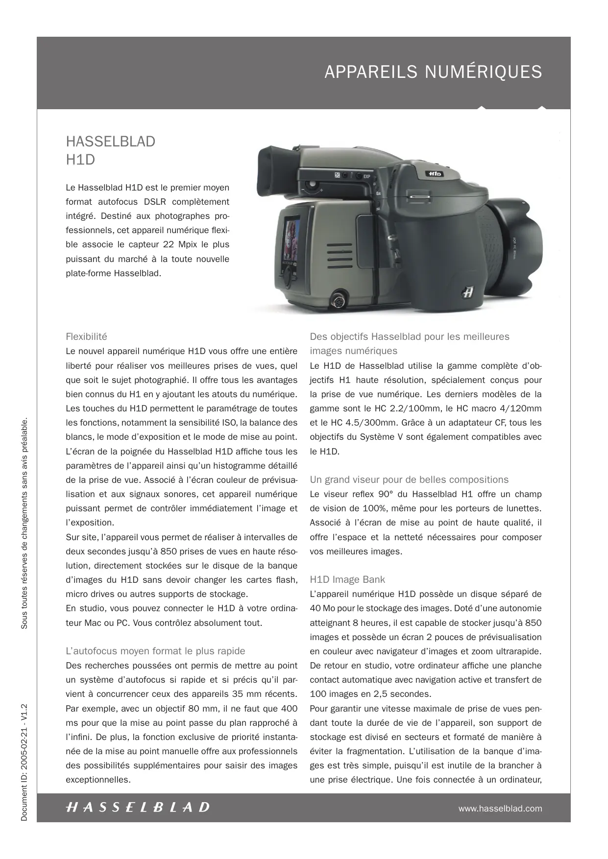 H1D - Appareil photo moyen format HASSELBLAD - Notice d'utilisation et mode d'emploi gratuit
