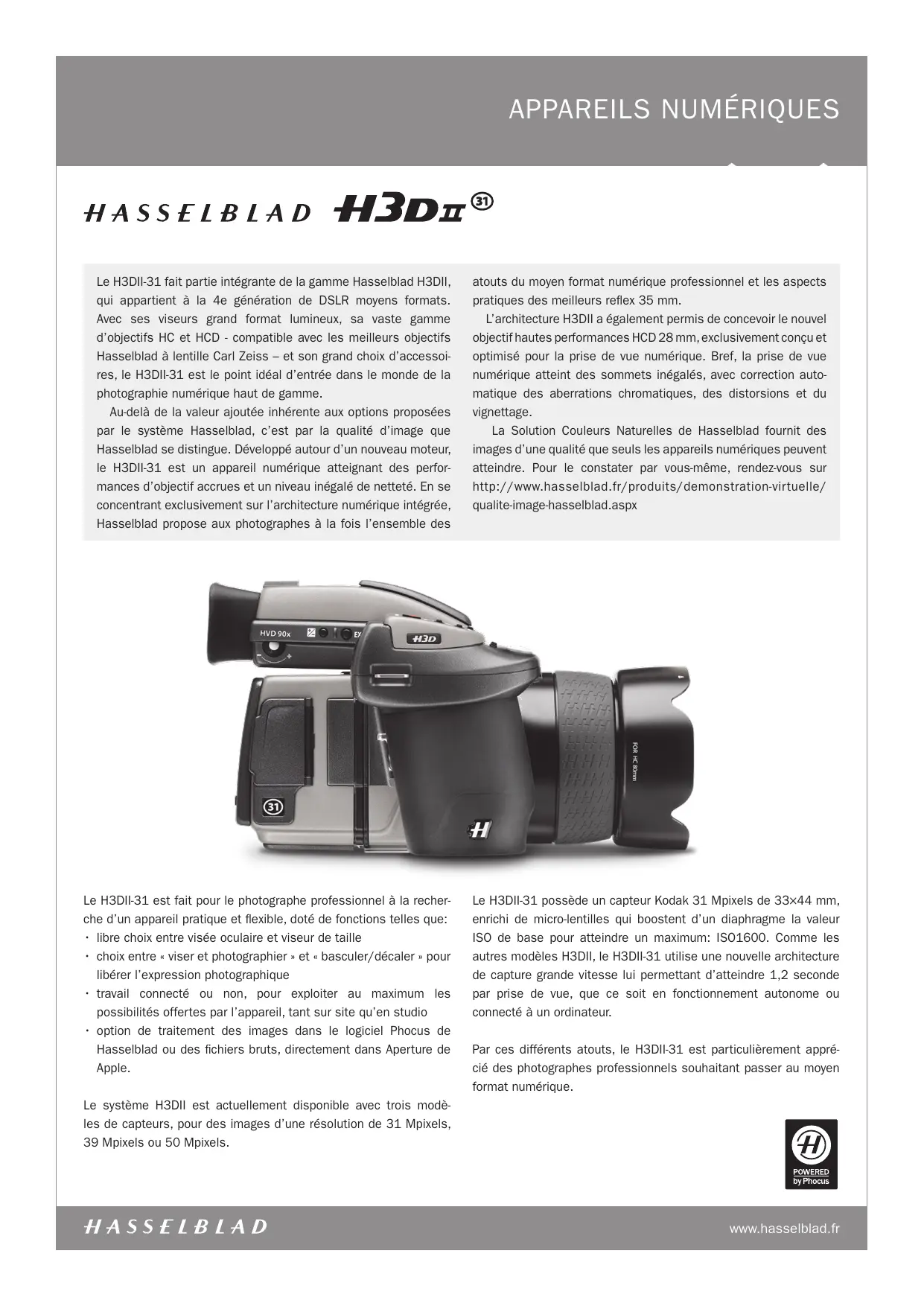 APPAREILS NUMÉRIQUES Le H3DII-31 fait partie intégrante de la gamme Hasselblad H3DII, qui appartient à la 4e génération de DSLR moyens formats. Avec ses viseurs grand format lumineux, sa vaste gamme d’objectifs HC et HCD - compatible avec les meilleurs objectifs Hasselblad à lentille Carl Zeiss – et son grand choix d’accessoires, le H3DII-31 est le point idéal d’entrée dans le monde de la photographie numérique haut de gamme. Au-delà de la valeur ajoutée inhérente aux options proposées par le système Hasselblad, c’est par la qualité d’image que Hasselblad se distingue. Développé autour d’un nouveau moteur, le H3DII-31 est un appareil numérique atteignant des perfor mances d’objectif accrues et un niveau inégalé de netteté. En se concentrant exclusivement sur l’architecture numérique intégrée, Hasselblad propose aux photographes à la fois l’ensemble des