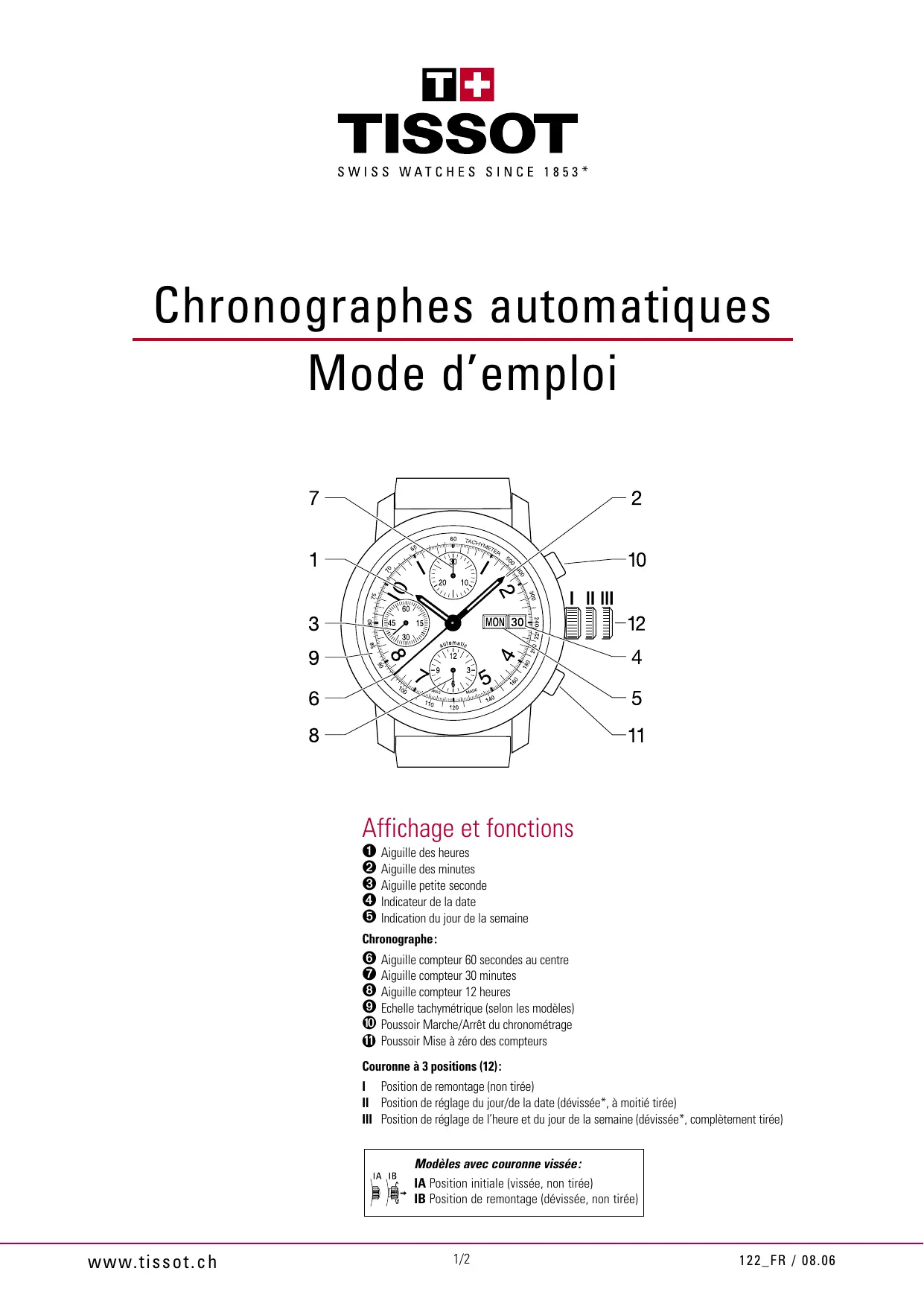 Chronographes automatiques Mode d’emploi Affichage et fonctions Aiguille des heures Aiguille des minutes Aiguille petite seconde Indicateur de la date Indication du jour de la semaine Chronographe : Aiguille compteur 60 secondes au centre Aiguille compteur 30 minutes Aiguille compteur 12 heures Echelle tachymétrique (selon les modèles) Poussoir Marche/Arrêt du chronométrage 11 Poussoir Mise à zéro des compteurs Couronne à 3 positions (12) : I Position de remontage (non tirée) II Position de réglage du jour/de la date (dévissée*, à moitié tirée) III Position de réglage de l’heure et du jour de la semaine (dévissée*, complètement tirée) Modèles avec couronne vissée: IA Position initiale (vissée, non tirée) IB Position de remontage (dévissée, non tirée) w w w. t i s s o t . ch 1/2 122_FR / 08.06 Chronographes automatiques