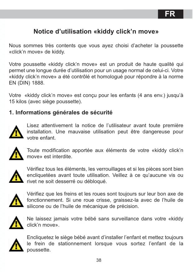 Lisez attentivement la notice de l’utilisateur avant toute première installation. Une mauvaise utilisation peut être dangereuse pour votre enfant. Toute modification apportée aux éléments de votre «kiddy click’n move» est interdite. Vérifiez tous les éléments, les verrouillages et si les pièces sont bien encliquetées avant toute utilisation. Veillez à ce qu’aucune vis ou rivet ne soit desserré ou débloqué. Vérifiez que les freins et les roues sont toujours sur leur bon axe de fonctionnement. Si une roue crisse, graissez-la avec de l’huile de silicone ou de l’huile de mécanique de précision. Ne laissez jamais votre bébé sans surveillance dans votre «kiddy click’n move». Encliquetez le siège bébé avant d’installer l’enfant et mettez toujours le frein de stationnement lorsque vous sortez l’enfant de la poussette. 38