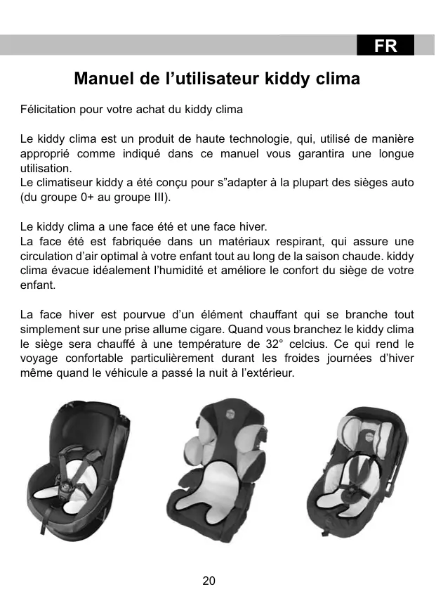 Félicitation pour votre achat du kiddy clima Le kiddy clima est un produit de haute technologie, qui, utilisé de manière approprié comme indiqué dans ce manuel vous garantira une longue utilisation. Le climatiseur kiddy a été conçu pour s”adapter à la plupart des sièges auto (du groupe 0+ au groupe III). Le kiddy clima a une face été et une face hiver. La face été est fabriquée dans un matériaux respirant, qui assure une circulation d’air optimal à votre enfant tout au long de la saison chaude. kiddy clima évacue idéalement l’humidité et améliore le confort du siège de votre enfant. La face hiver est pourvue d’un élément chauffant qui se branche tout simplement sur une prise allume cigare. Quand vous branchez le kiddy clima le siège sera chauffé à une température de 32° celcius. Ce qui rend le voyage confortable particulièrement durant les froides journées d’hiver même quand le véhicule a passé la nuit à l’extérieur.