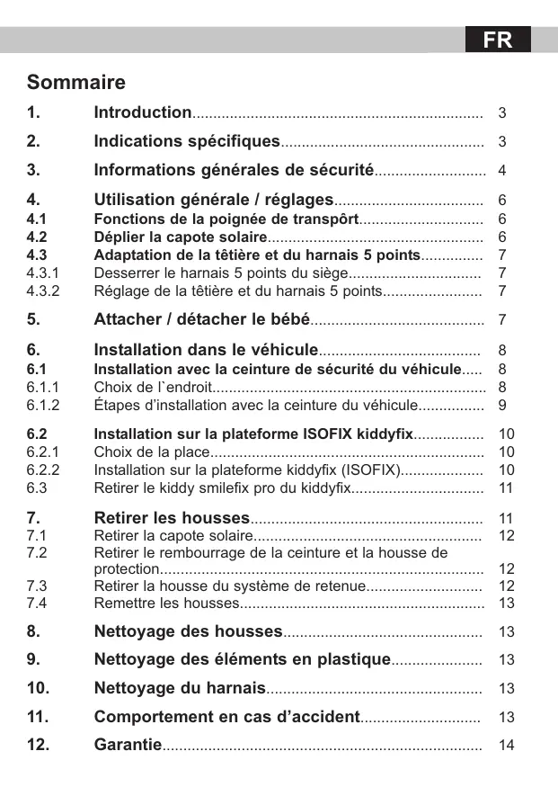 AVERTISSEMENT : Vérifiez régulièrement les composantes du système de retenue. Il faut surtout vérifier l’usure et éventuellement les dommages du harnais et dufermoir. Ne réglez jamais le système de retenue pendant le trajet! AVERTISSEMENT : Placez toujours votre kiddy dans le sens contraire de la route (dos face route). AVERTISSEMENT : Respectez les consignes du guide d’utilisation du véhicule dans lequel le système de retenue est placé.