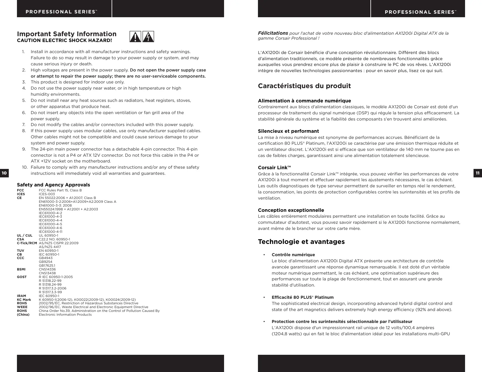 Félicitations pour l'achat de votre nouveau bloc d'alimentation AX1200i Digital ATX de la gamme Corsair Professional ! L'AX1200i de Corsair bénéficie d'une conception révolutionnaire. Différent des blocs d'alimentation traditionnels, ce modèle présente de nombreuses fonctionnalités grâce auxquelles vous prendrez encore plus de plaisir à construire le PC de vos rêves. L'AX1200i intègre de nouvelles technologies passionnantes : pour en savoir plus, lisez ce qui suit. Caractéristiques du produit Alimentation à commande numérique Contrairement aux blocs d'alimentation classiques, le modèle AX1200i de Corsair est doté d'un processeur de traitement du signal numérique (DSP) qui régule la tension plus efficacement. La stabilité générale du système et la fiabilité des composants s'en trouvent ainsi améliorées. Silencieux et performant La mise à niveau numérique est synonyme de performances accrues. Bénéficiant de la certification 80 PLUS® Platinum, l'AX1200i se caractérise par une émission thermique réduite et un ventilateur discret. L'AX1200i est si efficace que son ventilateur de 140 mm ne tourne pas en cas de faibles charges, garantissant ainsi une alimentation totalement silencieuse. Corsair Link™ Grâce à la fonctionnalité Corsair Link™ intégrée, vous pouvez vérifier les performances de votre AX1200i à tout moment et effectuer rapidement les ajustements nécessaires, le cas échéant. Les outils diagnostiques de type serveur permettent de surveiller en temps réel le rendement, la consommation, les points de protection configurables contre les surintensités et les profils de ventilation. Conception exceptionnelle Les câbles entièrement modulaires permettent une installation en toute facilité. Grâce au commutateur d'autotest, vous pouvez savoir rapidement si le AX1200i fonctionne normalement, avant même de le brancher sur votre carte mère. Technologie et avantages