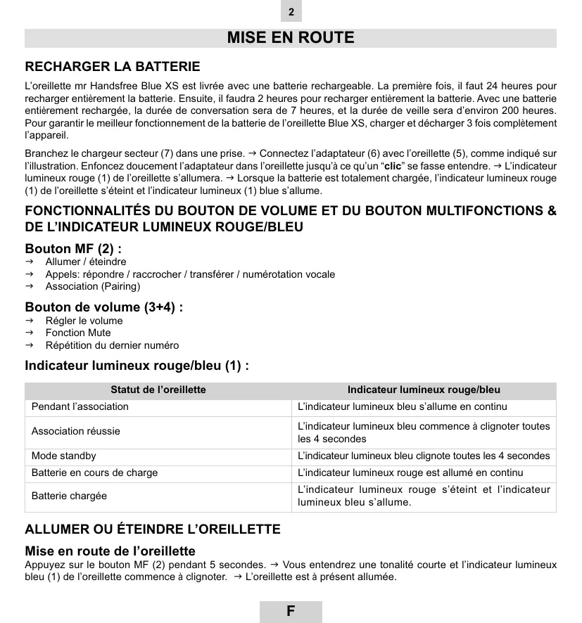 Quand le Blue XS a ete debranche : Allumez loreillette et appuyez sur le bouton MF (2) pendant 1 seconde.