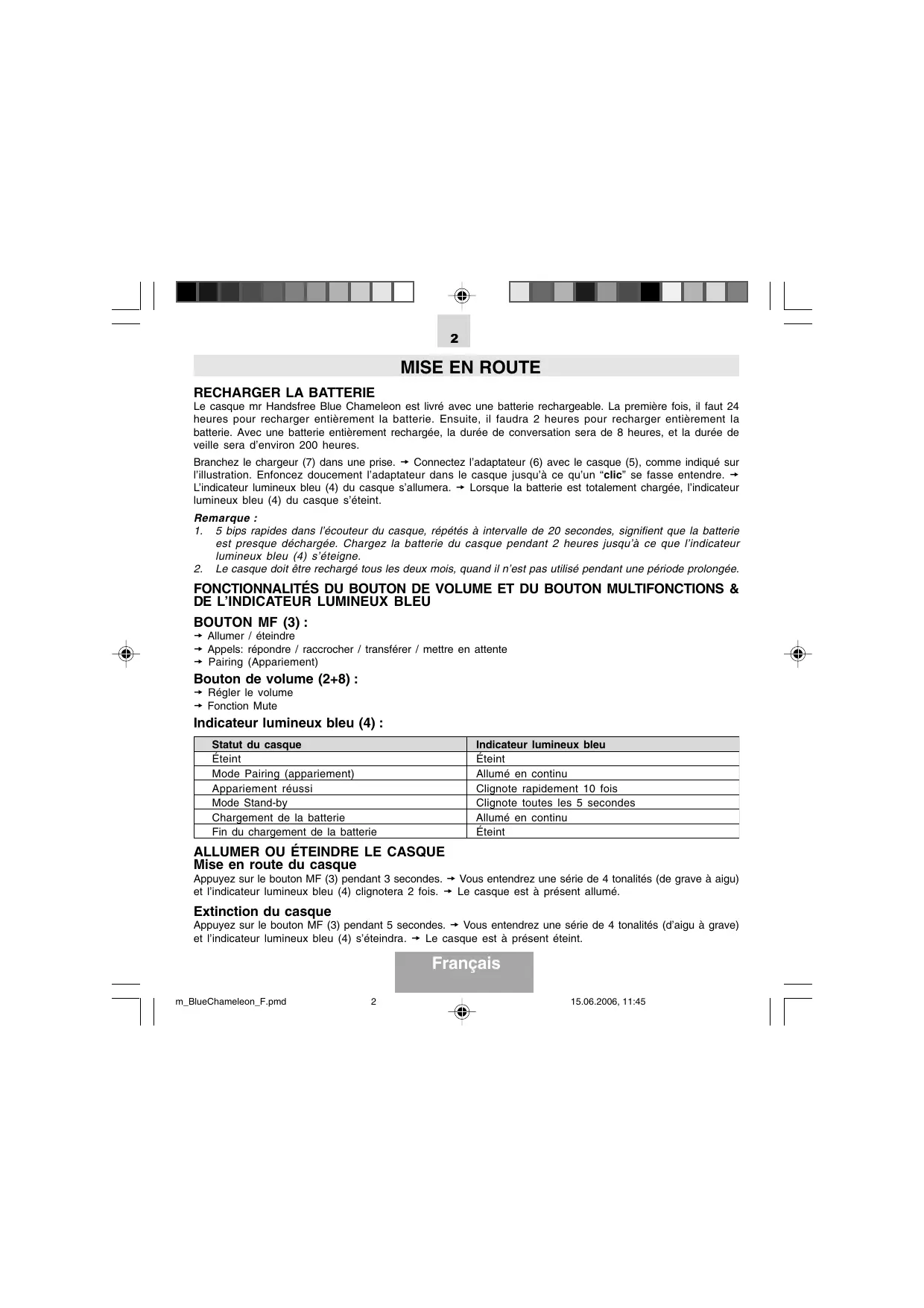 Du fait de la conception différente de certains téléphones mobiles, une déconnexion automatique peut se produit même quand le casque Blue Chameleon est allumé. Dans ce cas, le casque ne sonnera pas quand vous receivez un appel. Appuyez sur le bouton MF (3) pendant 3 sec. pour reconnectcer le casque au téléphone mobile pour la reception d'un appel.