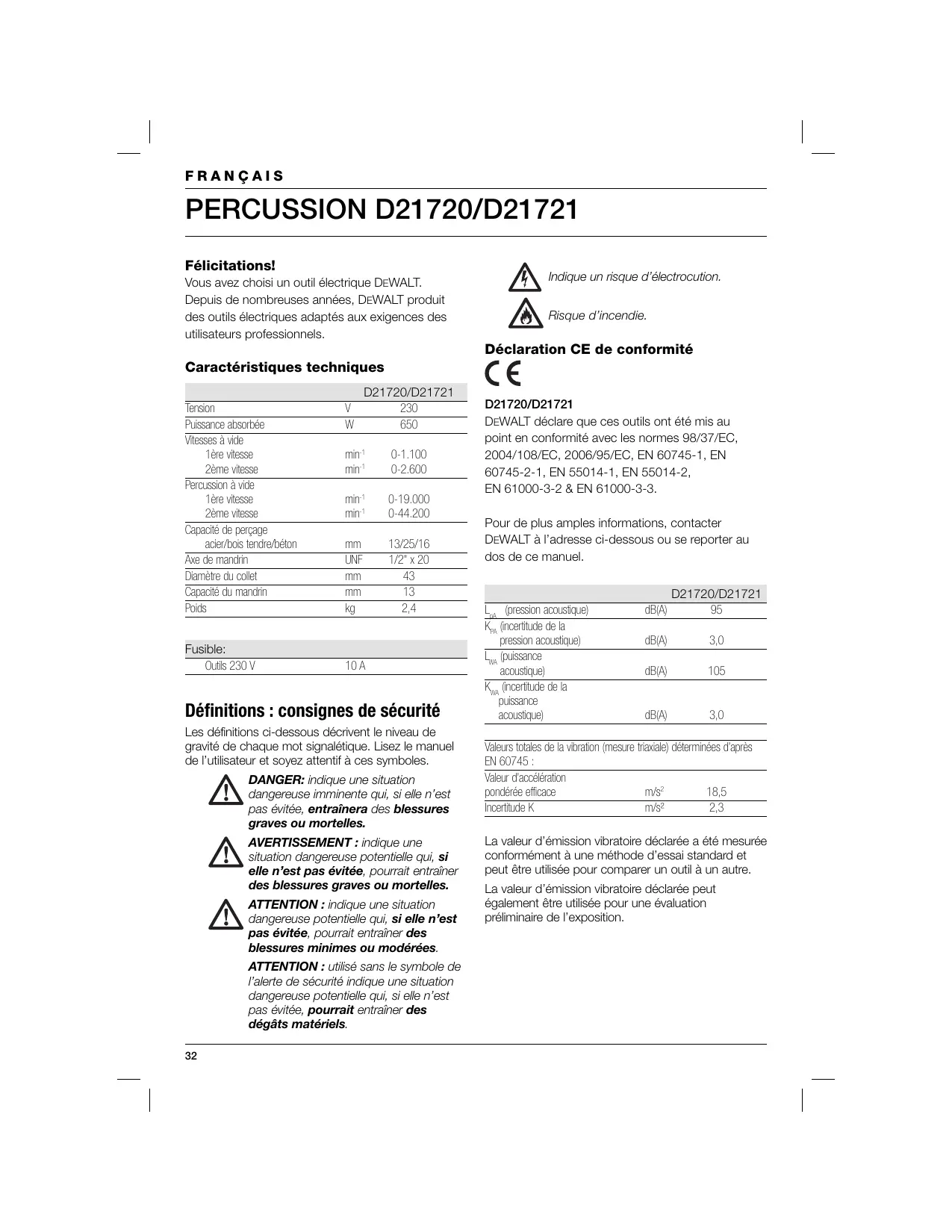 Félicitations! Vous avez choisi un outil électrique DEWALT. Depuis de nombreuses années, DEWALT produit des outils électriques adaptés aux exigences des utilisateurs professionnels. Indique un risque d’électrocution. Risque d’incendie. Déclaration CE de conformité Caractéristiques techniques Tension Puissance absorbée Vitesses à vide 1ère vitesse 2ème vitesse Percussion à vide 1ère vitesse 2ème vitesse Capacité de perçage acier/bois tendre/béton Axe de mandrin Diamètre du collet Capacité du mandrin Poids Fusible: Outils 230 V