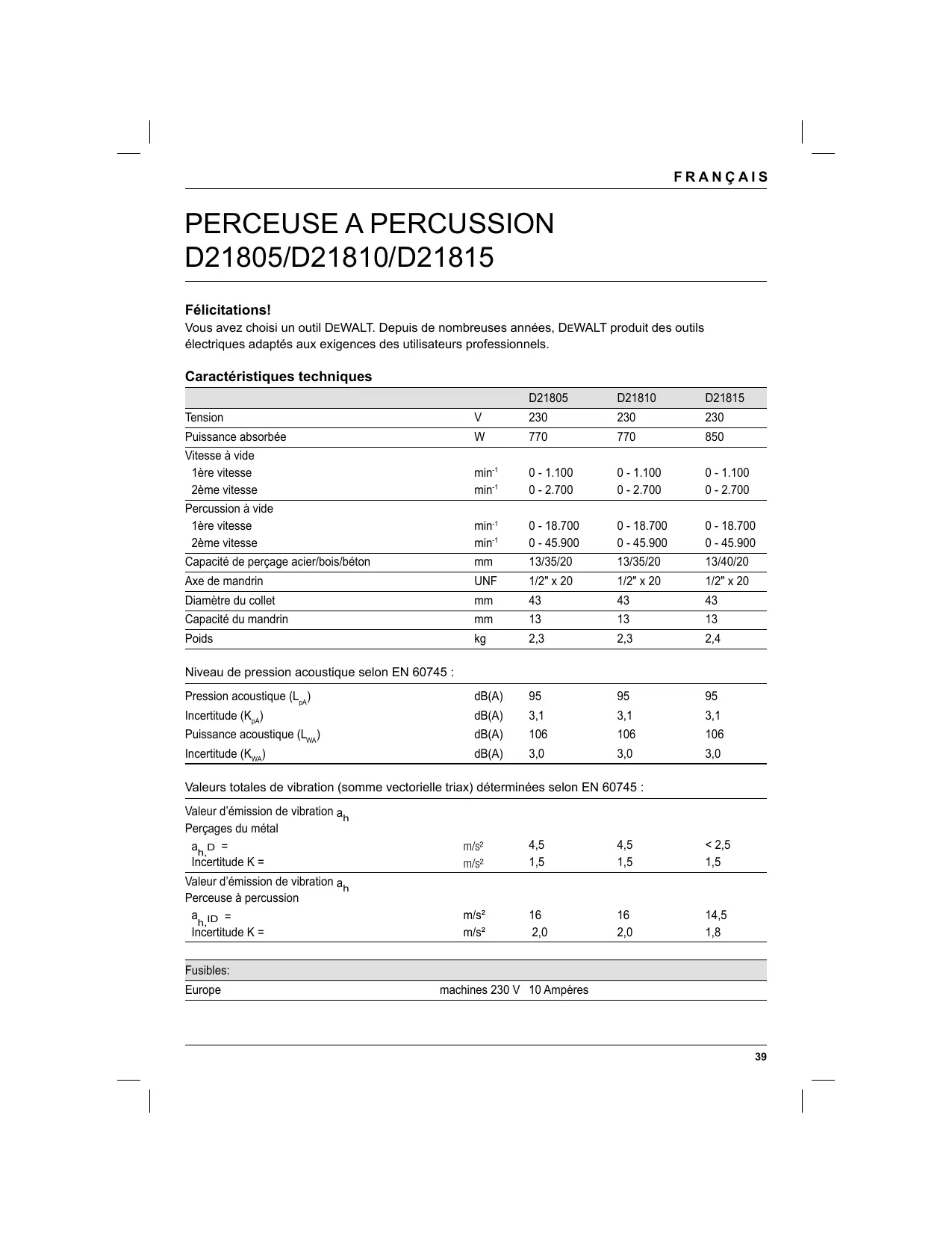D21805/D21810/D21815 Félicitations! Vous avez choisi un outil DEWALT. Depuis de nombreuses années, DEWALT produit des outils électriques adaptés aux exigences des utilisateurs professionnels. Caractéristiques techniques D21805 D21810 Tension