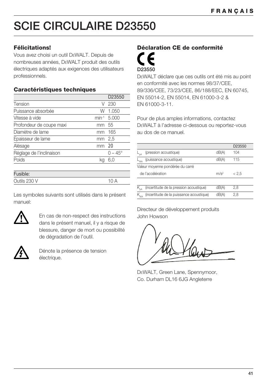 Félicitations! Déclaration CE de conformité Vous avez choisi un outil DEWALT. Depuis de nombreuses années, DEWALT produit des outils électriques adaptés aux exigences des utilisateurs professionnels. Caractéristiques techniques Tension Puissance absorbée Vitesse à vide Profondeur de coupe maxi Diamètre de lame Epaisseur de lame Alésage Réglage de l’inclinaison Poids D23550