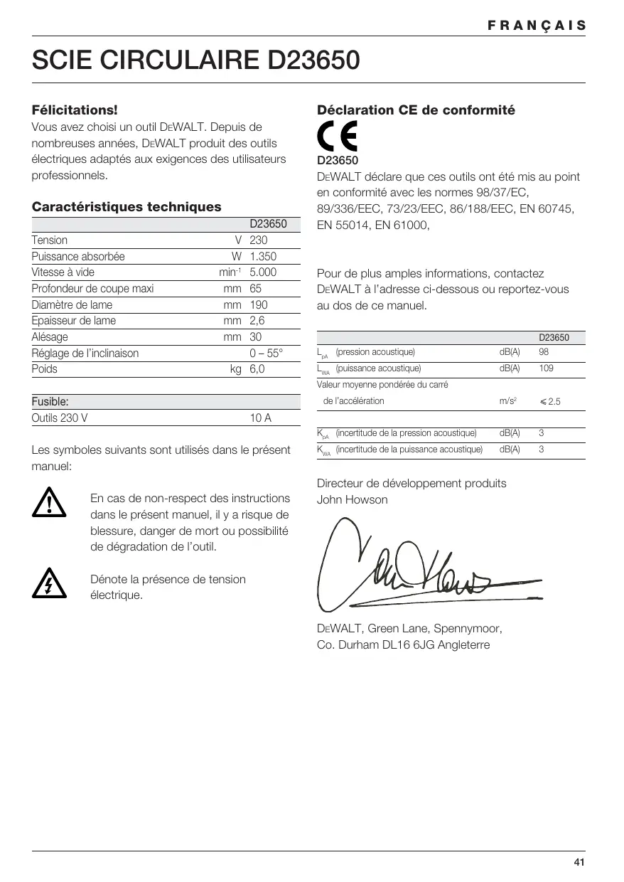 Félicitations! Déclaration CE de conformité Vous avez choisi un outil DEWALT. Depuis de nombreuses années, DEWALT produit des outils électriques adaptés aux exigences des utilisateurs professionnels. Caractéristiques techniques Tension Puissance absorbée Vitesse à vide Profondeur de coupe maxi Diamètre de lame Epaisseur de lame Alésage Réglage de l’inclinaison Poids D23650