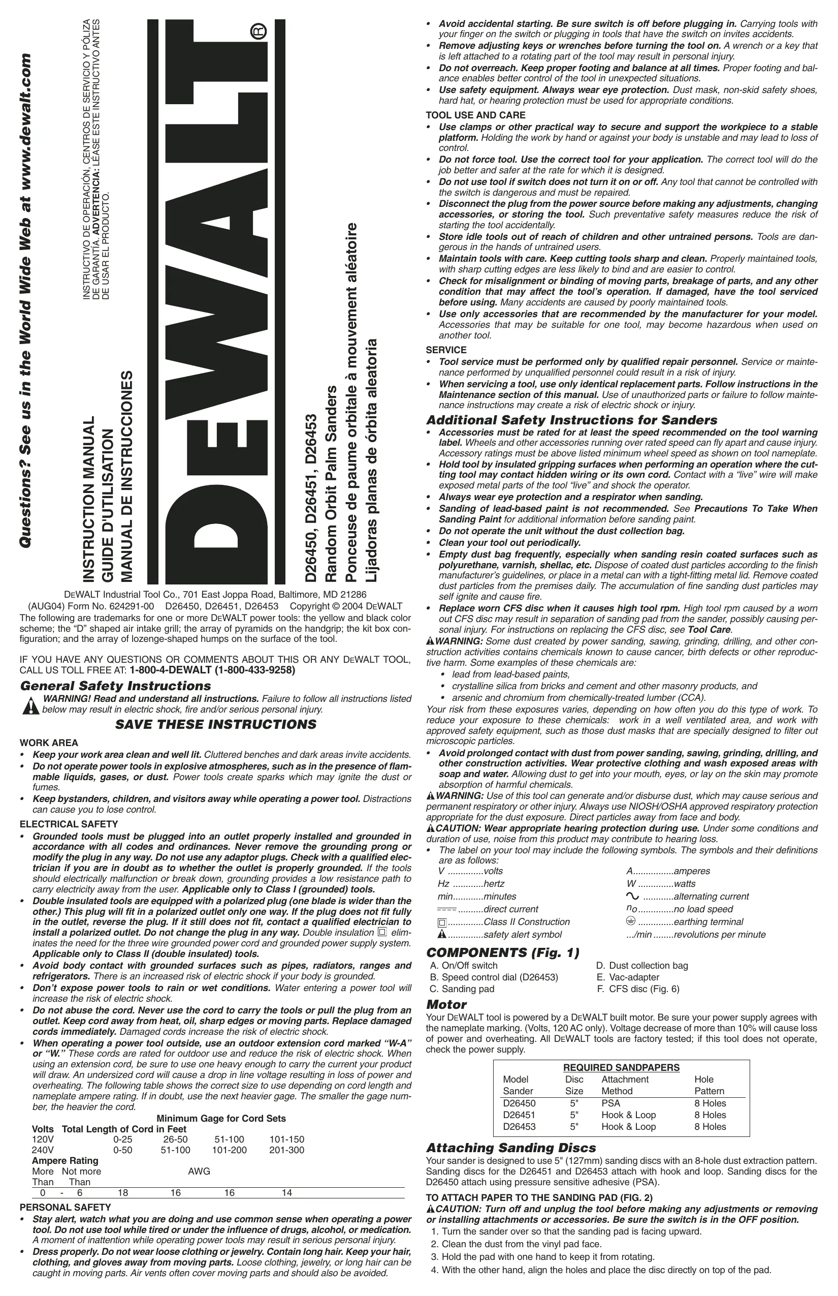 • La vitesse des accessoires doit correspondre à la vitesse minimale recommandée indiquée sur l’étiquette d’avertissement de l’outil, car les meules et les accessoires qui sont réglés à une vitesse trop élevée peuvent se briser et occasionner des blessures lorsque des fragments de métal sont projetés. S’assurer que l’intensité nominale des accessoires utilisés est supérieure à la vitesse minimum des meules indiquée sur la plaque signalétique. • Tenir l’outil par les surfaces isolées prévues à cette fin lorsqu’il risque d’entrer en contact avec des fils cachés ou son propre cordon, car de tels contacts peuvent mettre les pièces métalliques de l’outil sous tension, engendrant des risques de choc électrique. • Toujours porter des lunettes de protection et un appareil respiratoire antipoussière pendant le ponçage. • Le ponçage de peintures à base de plomb n’est pas recommandé. Se reporter à la section Mesures de précaution concernant le ponçage de peinture pour plus d’informations quant au ponçage des peintures. • Ne pas utiliser l’appareil sans le sac à poussières. • Nettoyer cet outil périodiquement. • Vider le sac à poussières fréquemment, particulièrement lors du ponçage de surfaces enduites de résines synthétiques tels polyuréthanes, vernis, gommes laques, etc. Se défaire des particules de poussières enrobées conformément aux directives du fabricant, ou les mettre dans une boîte métallique à fermeture hermétique. Éliminer quotidiennement toute particule de poussière enrobée des lieux de travail. L’accumulation de fines particules de poussières poncées pourrait s’auto enflammer et causer un incendie. • Changer tout disque CFS lorsqu’il oblige l’appareil à tourner trop rapidement. Un tour par minute élevé causé par un disque CFS usé pourrait causer la séparation du tampon ponceur de la ponceuse, et poser de risques de blessure. Pour toute instruction relative au changement du disque CFS, se reporter à la section Entretien de l’outil. AVERTISSEMENT : Certains outils électriques, tels que les sableuses, les scies, les meules, les perceuses ou certains autres outils de construction, peuvent produire de la poussière contenant des produits chimiques susceptibles d’entraîner le cancer, des malformations congénitales ou pouvant être nocifs pour le système reproductif. Parmi ces produits chimiques, on retrouve : • le plomb dans les peintures à base de plomb, • la silice cristalline dans les briques et le ciment et autres produits de maçonnerie, • l’arsenic et le chrome dans le bois de sciage ayant subi un traitement chimique (comme l’arséniate de cuivre et de chrome). Le risque associé à de telles expositions varie selon la fréquence avec laquelle on effectue ces travaux. Pour réduire l’exposition à de tels produits, il faut travailler dans un endroit bien aéré et utiliser le matériel de sécurité approprié, tel un masque anti-poussières spécialement conçu pour filtrer les particules microscopiques. • Éviter tout contact prolongé avec la poussière soulevée par cet outil ou autres outils électriques. Porter des vêtements de protection et nettoyer les parties exposées du corps à l’eau savonneuse. S’assurer de bien se protéger afin d’éviter d’absorber par la bouche, les yeux ou la peau des produits chimiques nocifs. AVERTISSEMENT : Cet outil peut produire et répandre de la poussière susceptible de causer des dommages sérieux et permanents au système respiratoire. Toujours utiliser un appareil respiratoire anti-poussières approprié approuvé par le NIOSH ou l’OSHA. Diriger les particules dans le sens opposé du visage et du corps. MISE EN GARDE : Porter un appareil de protection personnel anti-bruit approprié durant l’utilisation. Sous certaines conditions et pendant toute la durée de l’utilisation, le bruit émanant de ce produit pourrait contribuer à la perte d’audition. • L’étiquette apposée sur l’outil peut afficher les symboles suivants. Ces symboles et leurs définitions sont les suivants : V volts A ampères Hz hertz Modèle de ponceuse D26450 D26451 INSTALLATION DU PAPIER SUR LE TAMPON PONCEUR (FIG. 2) MISE EN GARDE : Arrêter et débrancher l’outil avant d’effectuer un réglage ou de retirer ou d’installer une pièce ou un accessoire. S’assurer que l’interrupteur est en position d’arrêt. 1. Tourner la ponceuse de façon à ce que le tampon ponceur soit sur le dessus. 2. Éliminer toute poussière du tampon vinyle. 3. Maintenir le tampon d’une main pour l’empêcher de tourner. 4. De l’autre main, aligner les trous et placer le disque directement sur le tampon. REMARQUE : Ne pas utiliser de filtre à poncer (ex. : les filtres utilisés pour poncer le placoplâtre) directement sur un tampon à crochet et boucle. L’écran ne tiendra pas et endommagera les crochets du tampon. Les crochets du tampon s’useront très rapidement si laissés en contact avec la surface à travailler pendant le fonctionnement de l’appareil.