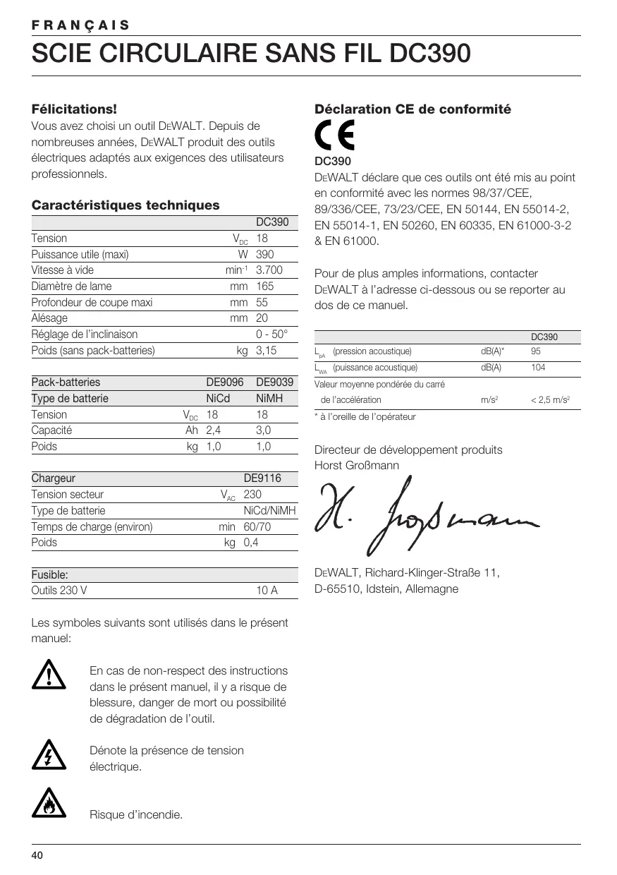 - à l’oreille de l’opérateur Directeur de développement produits Horst Großmann DC390 DEWALT déclare que ces outils ont été mis au point en conformité avec les normes 98/37/CEE, 89/336/CEE, 73/23/CEE, EN 50144, EN 55014-2, EN 55014-1, EN 50260, EN 60335, EN 61000-3-2 & EN 61000. FRANÇAIS Consignes de sécurité Afin de réduire le risque de décharge électrique, de blessure et d’incendie lors de l’utilisation d’outils électriques, observer les consignes de sécurité fondamentales en vigueur. Lire et observer attentivement les instructions contenues dans ce manuel avant d’utiliser l’outil. Conservez ce manuel pour pouvoir le consulter lors de prochaines utilisations. Généralités 1 Conserver votre aire de travail propre et bien rangée Le désordre augmente les risques d’accident. 2 Tenir compte des conditions ambiantes Ne pas exposer l’outil à la pluie. Ne pas exposer l’outil à l’humidité. Veiller à ce que l’aire de travail soit bien éclairée (250 - 300 Lux). Ne pas utiliser l’outil s’il existe un risque d’incendie ou d’explosion, par exemple en présence de liquides ou de gaz inflammables. 3 Tenir les enfants éloignés Ne pas laisser les enfants, les visiteurs ou les animaux s’approcher de l’aire de travail ou toucher l’outil ou le câble d’alimentation. 4 Porter des vêtements de travail appropriés Ne pas porter de vêtements flottants ni de bijoux. Ils pourraient être happés par les pièces en mouvement. Le cas échéant, porter une garniture convenable retenant les cheveux longs. Lorsque le travail s’effectue à l’extérieur, porter de préférence des gants adéquats et des chaussures antidérapantes. 5 Protections Porter en permanence des lunettes de protection. Porter un masque anti-poussière si le travail exécuté produit de la poussière ou des particules volantes. Si ces particules peuvent être extrêmement chaudes, porter également un tablier résistant à la chaleur. Toujours porter une protection auditive. Porter en permanence un casque de protection. 6 Adopter une position confortable Conserver en permanence son équilibre et les deux pieds à terre. 7 Faire preuve de vigilance Observer votre travail. Faire preuve de bon sens. Ne pas utiliser l’outil lorsque l’on est fatigué. 8 Bien fixer la pièce à travailler Pour plus de sécurité, fixer la pièce à travailler avec un dispositif de serrage ou un étau. Ainsi, vous aurez les deux mains libres pour manier l’outil. 9 Brancher le dispositif dépoussiéreur. Si vous disposez de systèmes pour brancher les dispositifs d’extraction et d’aspiration de poussière, s’assurer qu’ils sont bien branchés et qu’ils fonctionnent correctement. 10 Enlever les clés de réglage Avant de mettre l’outil en marche, vérifier toujours si les clés et outils de réglage ont été retirés. 11 Utiliser l’outil adéquat Le domaine d’utilisation de l’outil est décrit dans le présent manuel. Ne pas utiliser des outils ou des accessoires de trop petite taille pour exécuter des travaux lourds. Ne pas utiliser des outils à des fins et pour des travaux pour lesquels ils n’ont pas été conçus. Ne pas forcer sur l’outil. Attention ! L’utilisation d’accessoires ou la réalisation de travaux autres que ceux recommandés dans ce manuel pourrait entraîner un risque de blessure corporelle. 12 Contrôler si l’outil est endommagé Avant toute utilisation, s’assurer que l’outil et le câble d’alimentation ne sont pas endommagés. Vérifier l’alignement des pièces en mouvement, leur prise et toute rupture de pièces, tout endommagement des protections et des interrupteurs et toutes autres conditions pouvant affecter le fonctionnement de l’outil. Veiller à ce que l’outil fonctionne correctement et qu’il exécute les tâches pour lesquelles il est conçu. Ne pas utiliser l’outil si une pièce est défectueuse. Ne pas utiliser l’outil si l’interrupteur marche/arrêt ne fonctionne pas. Faire remplacer toute pièce endommagée par un agent DEWALT agréé. Ne jamais essayer de le réparer soi-même. 13 Retirer le pack-batteries Éteindre l’outil puis attendre qu’il s’arrête complètement avant de le laisser sans surveillance. Retirer le pack-batteries lorsqu’il n’est pas utilisé, avant de changer toute pièce ou tout accessoire et avant de procéder à l’entretien. 14 Pour éviter tout démarrage involontaire Éloignez vos doigts de l’interrupteur pour porter l’outil. S’assurer que l’outil est en position d’arrêt avant d’introduire le pack-batteries.