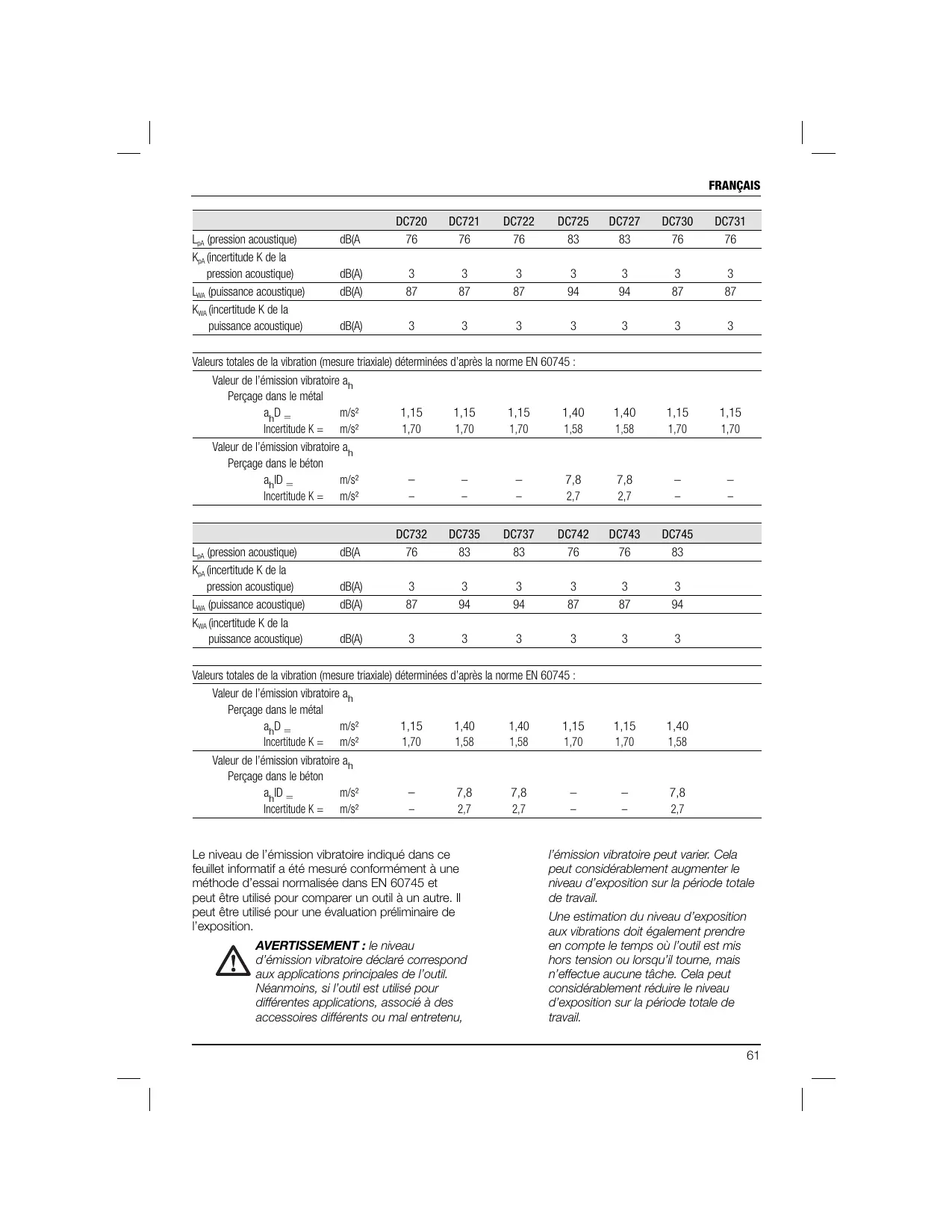 1,44 FRANÇAIS LpA (pression acoustique) KpA (incertitude K de la pression acoustique) LWA (puissance acoustique) KWA (incertitude K de la puissance acoustique) dB(A DC720