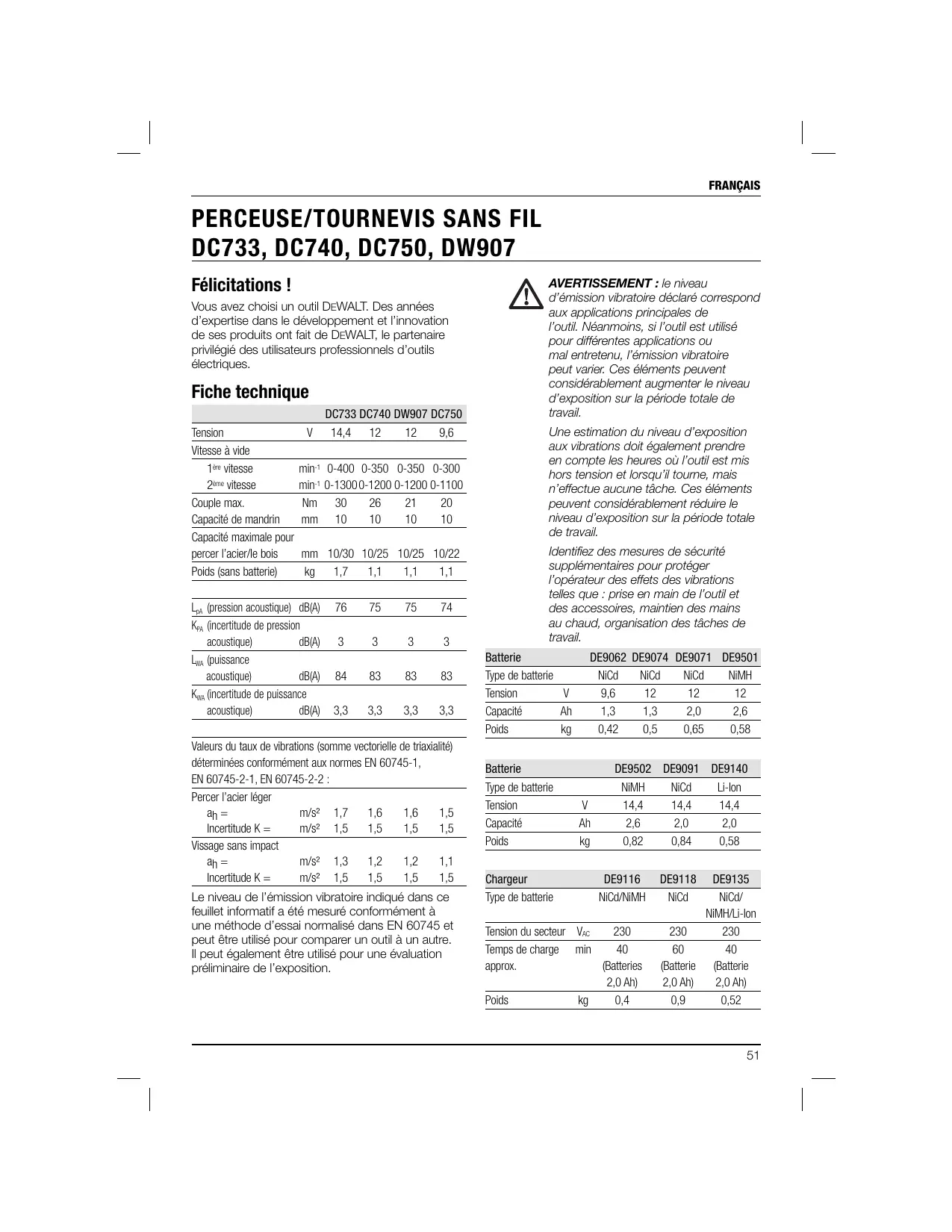 DEWALT certifie que les produits décrits dans le paragraphe « Fiche technique » ont été conçus conformément aux normes :