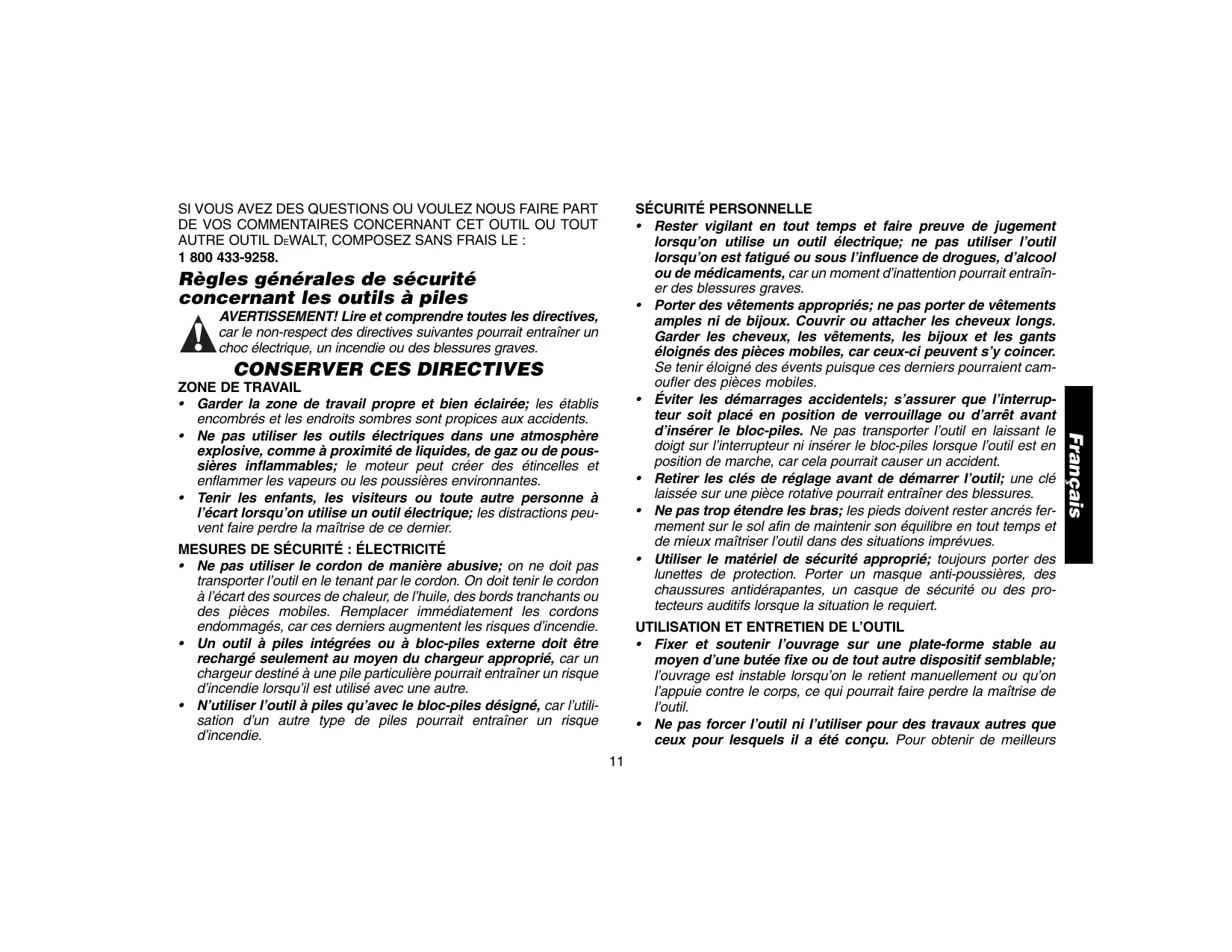 DEWALT réparera, sans frais, tout produit défectueux causé par un défaut de matériel ou de fabrication pour une période de trois ans à compter de la date d'achat. La présente garantie ne couvre pas les pièces dont la défectuosité a été causée par une usure normale ou l'usage abusif de l'outil. Pour obtenir de plus amples renseignements sur les pièces ou les réparations couvertes par la présente garantie, visiter le site www.dewalt.com ou composer le 1 800 433-9258 (1 800 4-DWALT). Cette garantie ne s'applique pas aux accessoires et ne vise pas les dommages causés par des réparations effectuées par un tiers. Cette garantie confère des droits légaux particuliers à l'acheteur, mais celui-ci pourrait aussi bénéficier d'autres droits variant d'un état ou d'une province à l'autre.