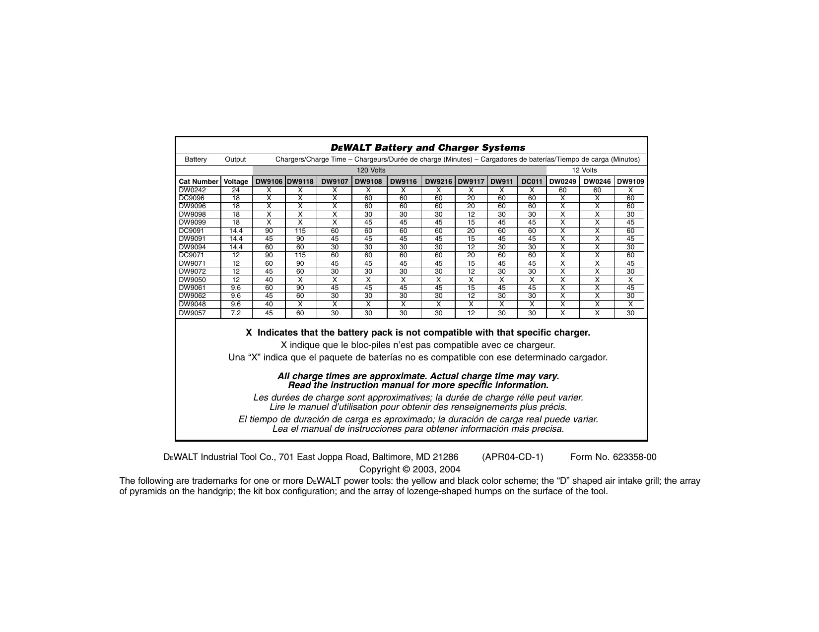 Chargeurs L'outil utilise un chargeur DEWALT de 12.0, 14.4, ou 18 volts. Les piles peuvent être chargées au moyen d'un chargeur DEWALT d'une heure ou de 15 minutes, ou d'un chargeur pour véhicules de 12 volts. S'assurer de lire toutes les consignes de sécurité avant d'utiliser le chargeur. Consulter le diagramme apparaissant sur la couverture arrière du présent guide afin de vérifier la compatibilité du chargeur avec le bloc-pile. Méthode de charge
