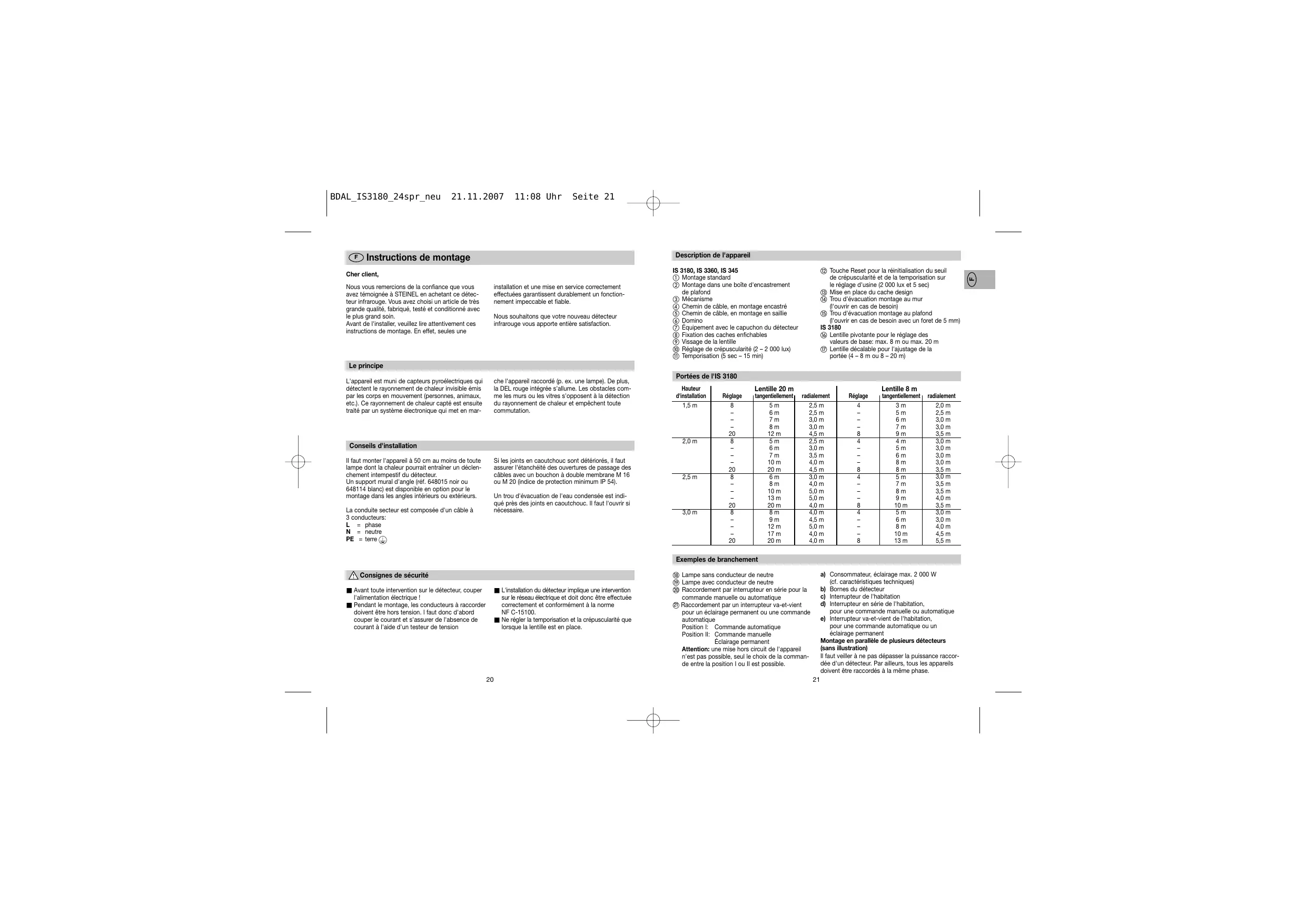 Nous vous remercions de la confiance que vous avez témoignée à STEINEL en achetant ce détecteur infrarouge. Vous avez choisi un article de très grande qualité, fabriqué, testé et conditionné avec le plus grand soin. Avant de l'installer, veuillez lire attentivement ces instructions de montage. En effet, seules une