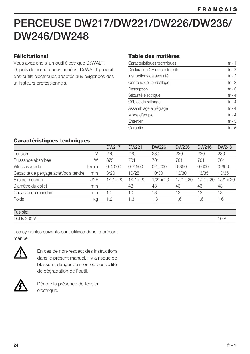 Table des matières Vous avez choisi un outil électrique DEWALT. Depuis de nombreuses années, DEWALT produit des outils électriques adaptés aux exigences des utilisateurs professionnels. Caractéristiques techniques Déclaration CE de conformité Instructions de sécurité Contenu de l’emballage Description Sécurité électrique Câbles de rallonge Assemblage et réglage Mode d’emploi Entretien Garantie fr - 1 fr - 2 fr - 2 fr - 3 fr - 3 fr - 4 fr - 4 fr - 4 fr - 4 fr - 5 fr - 5 Caractéristiques techniques Tension Puissance absorbée Vitesses à vide tr/min Capacité de perçage acier/bois tendre mm Axe de mandrin UNF Diamètre du collet Capacité du mandrin Poids