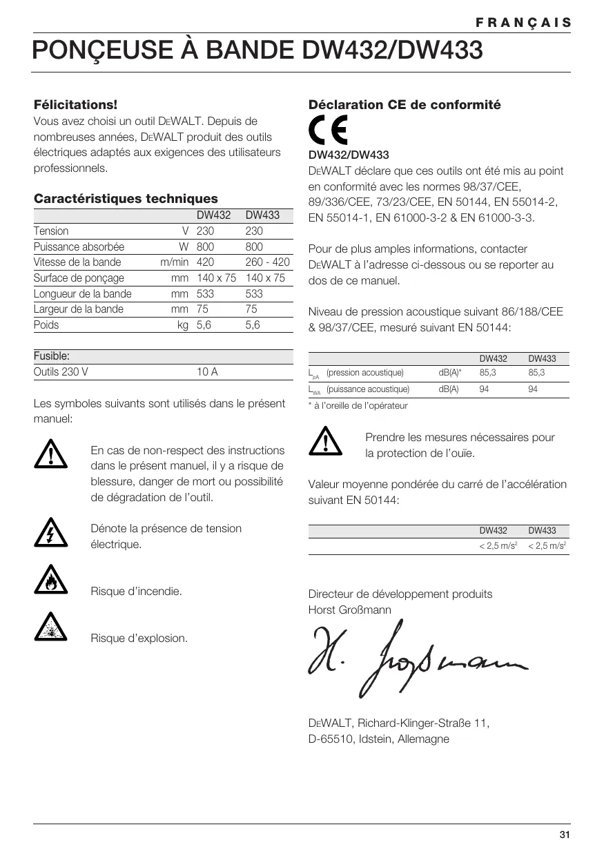 Tension V 230 290 Puissance absorbée W_ 800 800 Pour de plus amples informations, contacter Vitesse de la bande mymin_420 260-420 DeWALT à l'adresse ci-dessous ou se reporter au Surface de ponçage mm _140x75 140x75 dos de ce manuel Longueur de la bande mm_533 533 Largeur de la bande mm_75 75 Niveau de pression acoustique suivant 86/188/CEE. Poids kg 56 5,6 & 98/37/CEE, mesuré suivant EN 50144: Fusible: DW432 — DWASS Outils 230 V 10 A L,. (pression acoustique) ŒW 853 853