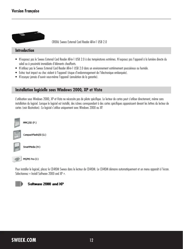 - N'exposez pas le Sweeex External Card Reader All-in-1 USB 2.0 à des températures extremes. N'exposez pas l'appareil à la lumière directe du soleil ou à proximite immédiate d'éléments chauflants.
