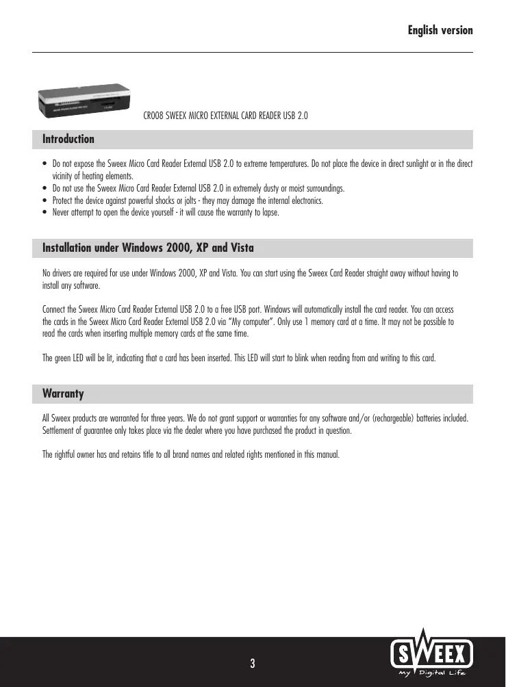 CR008 - Lecteur de cartes mémoire SWEEX - Notice d'utilisation et mode d'emploi gratuit