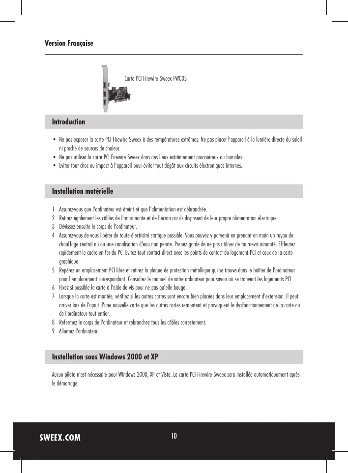 - Ne pas exposer la carte PCI Firewire Sweex à des températures extrêmes. Ne pas placer l'appareil à la lumière directe du soleil ni proche de sources de chaleur.
