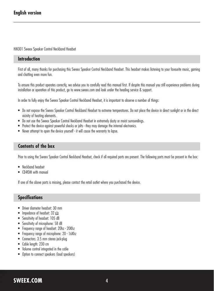 HM301 - Casque audio SWEEX - Notice d'utilisation et mode d'emploi gratuit