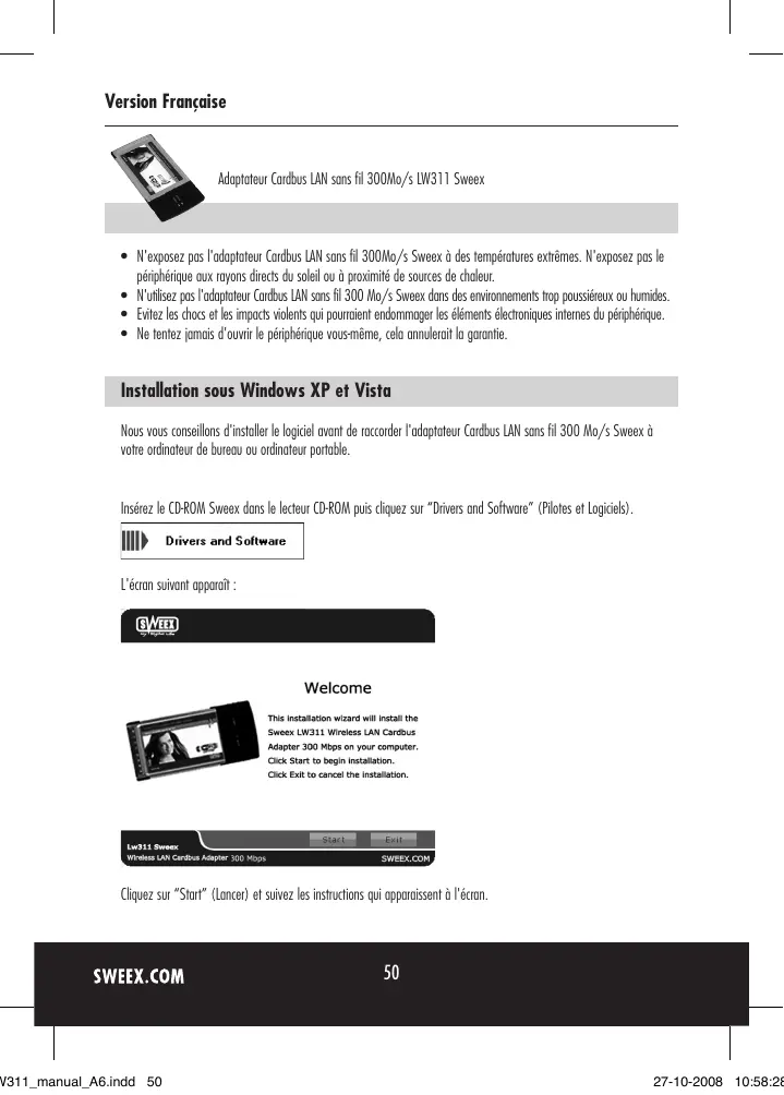 - N'exposez pas l'adaptateur Cardbus LAN sans fil 300Mo/s Sweeex à des températures exirèmes. N'exposez pas le péripérisque aux rayons directs du soleil ou à proximité de sources de chaleur.