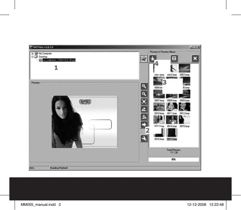 Paramétrage et fonctionnement A oide des touches au” et Bas” vous pouvez aroui es phos et naviguer à l'intérieur du men Appuyez sur “Men à l'aire de l'aparel pour accéder au menu et modifier es déférets paramètres. Pour sélectionner l'un des éléments du menu appuyez à nouveau sur touche Menu. Modtiz es voleurs à l'aide des touches Haut” et "Bas Le chargement des photos est possible en raccordent l'appareil à un port USB. MMO0S_manualindd 7 12-12-2008 12:22:49