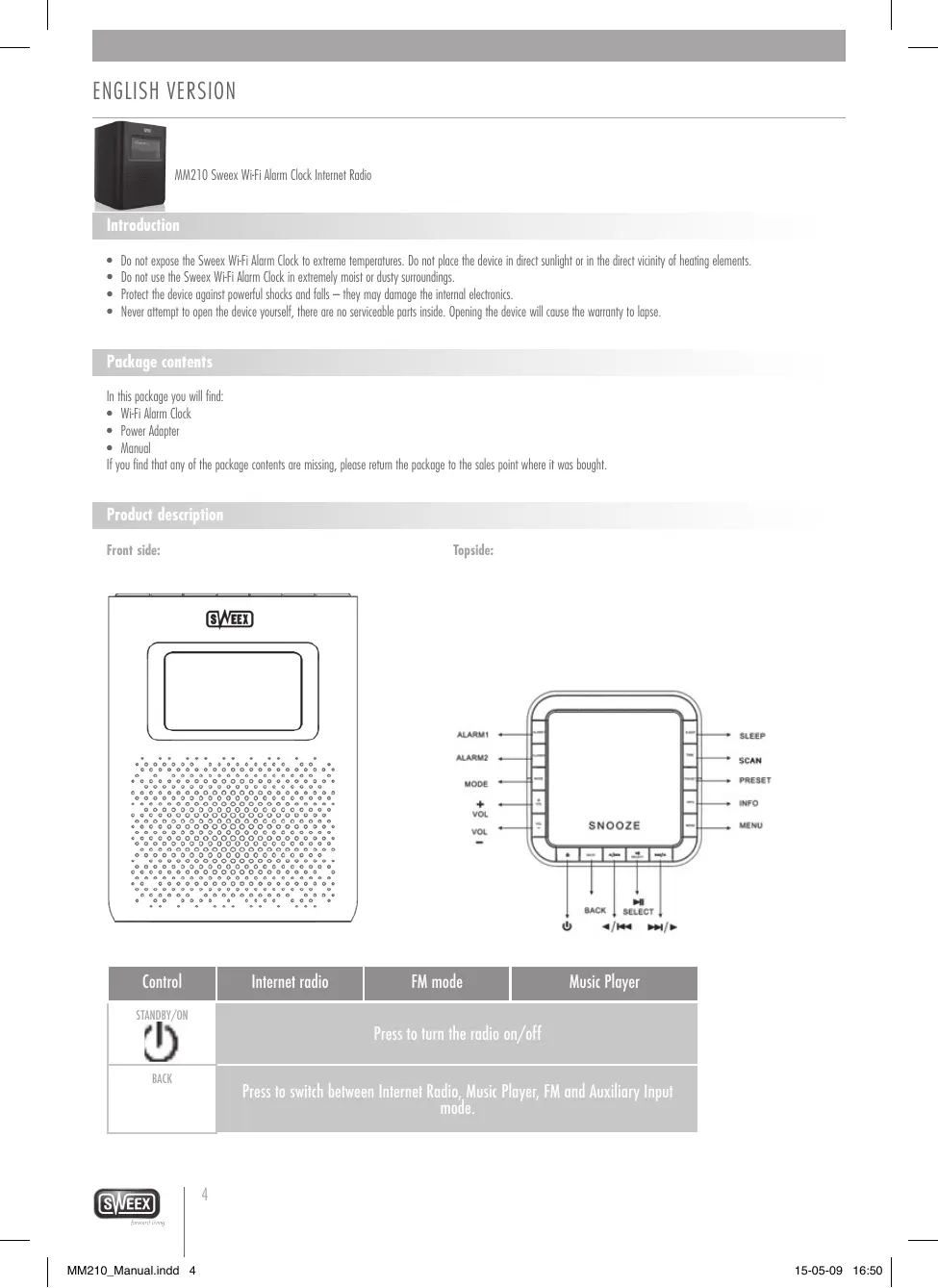 Téléchargez la notice de votre Radio-réveil au format PDF gratuitement ! Retrouvez votre notice MM210 - SWEEX et reprennez votre appareil électronique en main. Sur cette page sont publiés tous les documents nécessaires à l'utilisation de votre appareil MM210 de la marque SWEEX.