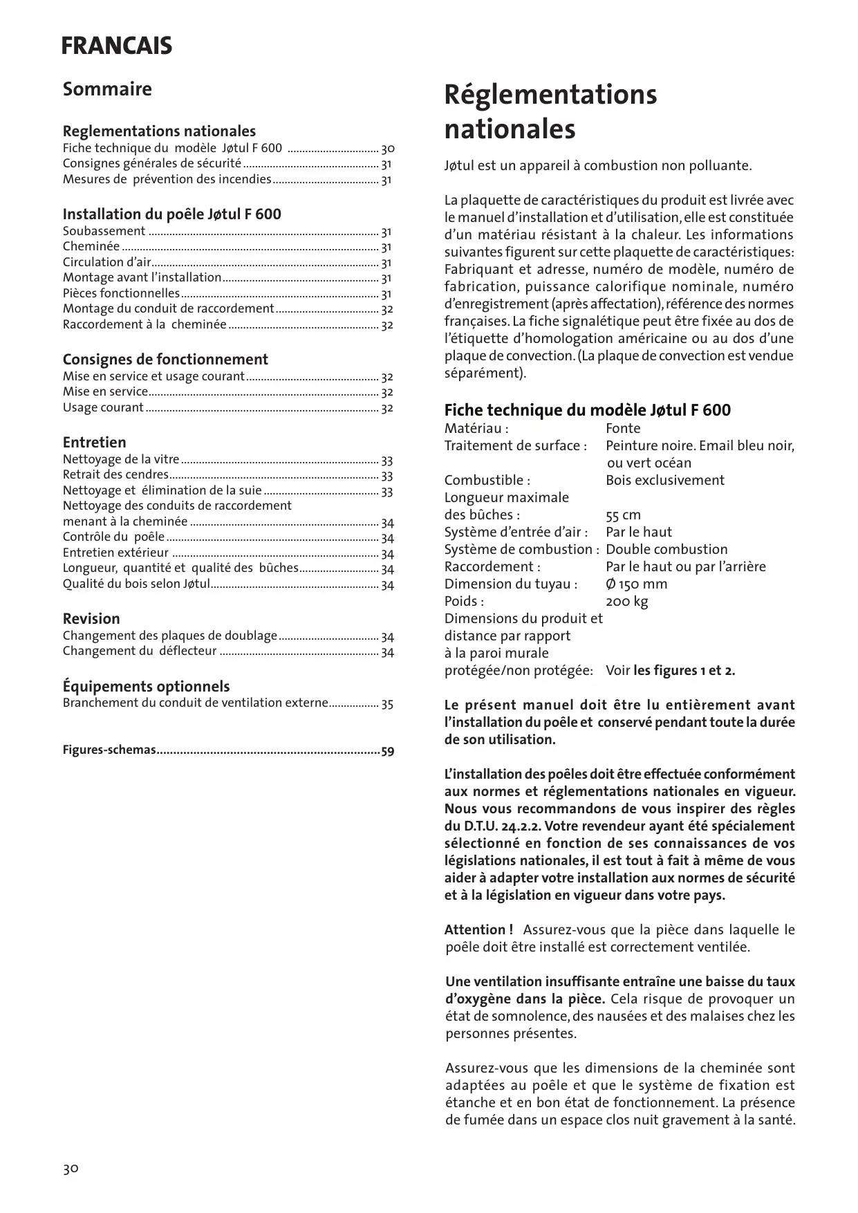 - Installation and Operating Instructions for the USA Installation et fonctionnement pour Canada Safety notice: If this solid fuel room heater is not properly installed, a house fire may result. For your safety, follow the installation directions. Contact local building or fire officials about restrictions and installation inspection requirements in your area. Kindly save these instructions for future reference. Avis de sécurité: Une installation non appropriée de ce poêle de chauffage risque de provoquer un incendie. Assurez votre sécurité en respectant les directives d’installation suivantes. Consultez les autorités locales du bâtiment ou de la prévention des incendies au sujet des restrictions et exigences relatives aux inspections d’installations dans votre région. Tested and listed by ITS, Intertek Testing Services, Middleton, Wisconsin. franCais Sommaire Reglementations nationales Fiche technique du modèle Jøtul F 600 p. 30