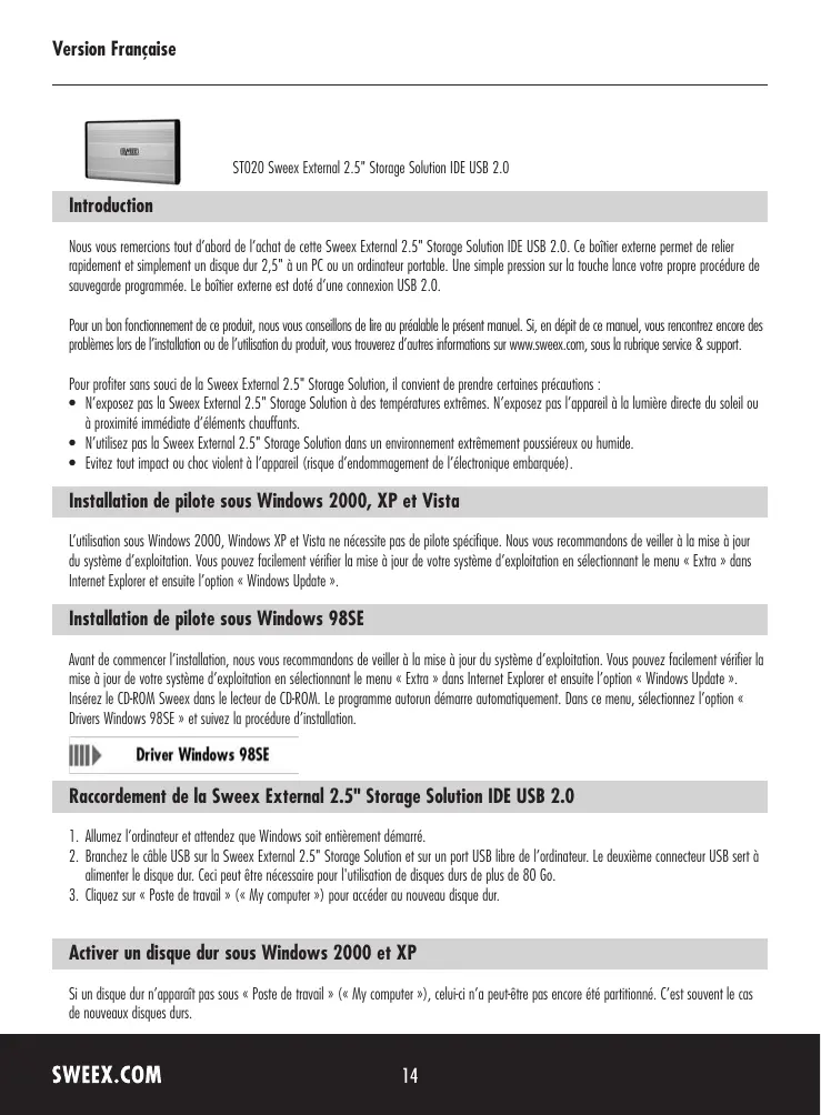 ST020 - Disque dur externe SWEEX - Notice d'utilisation et mode d'emploi gratuit