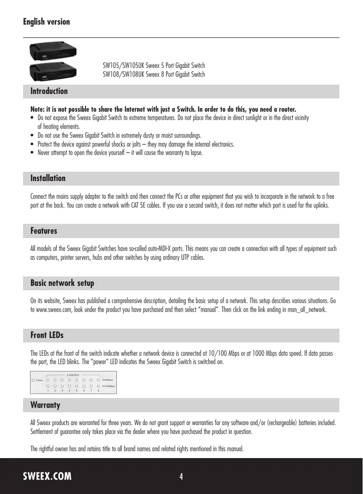 SW105 - Commutateur réseau SWEEX - Notice d'utilisation et mode d'emploi gratuit