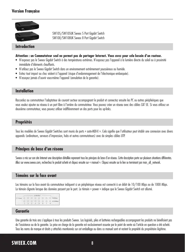 SW108 - Commutateur réseau SWEEX - Notice d'utilisation et mode d'emploi gratuit