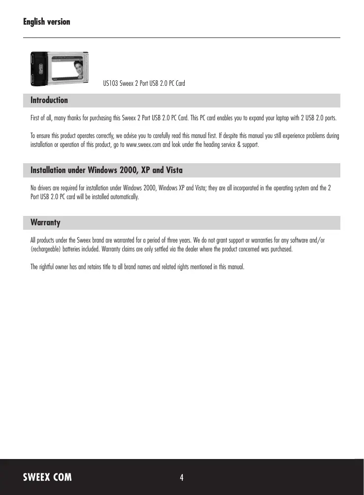 US103 - Carte d'extension USB SWEEX - Notice d'utilisation et mode d'emploi gratuit