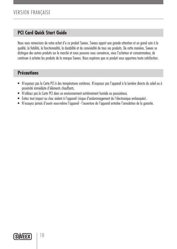 Version Française PCI Card Quick Start Guide N ous vous remercions de votre achat d’e ce produit Sweex. Sweex apport une grande attention et un grand soin à la qualité, la fiabilité, la fonctionnalité, la durabilité et de convivialité de tous ses produits. De cette manière, Sweex se distingue des autres produits sur le marché et nous pouvons vous convaincre, vous l’acheteur et consommateur, de continuer à acheter les produits de la marque Sweex. Nous espérons que ce produit vous apportera toute satisfaction. Précautions