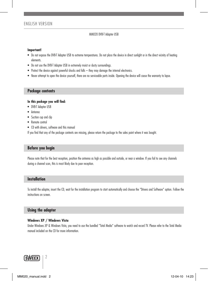 Retrouvez gratuitement la notice de l'appareil MM020 SWEEX au format PDF.