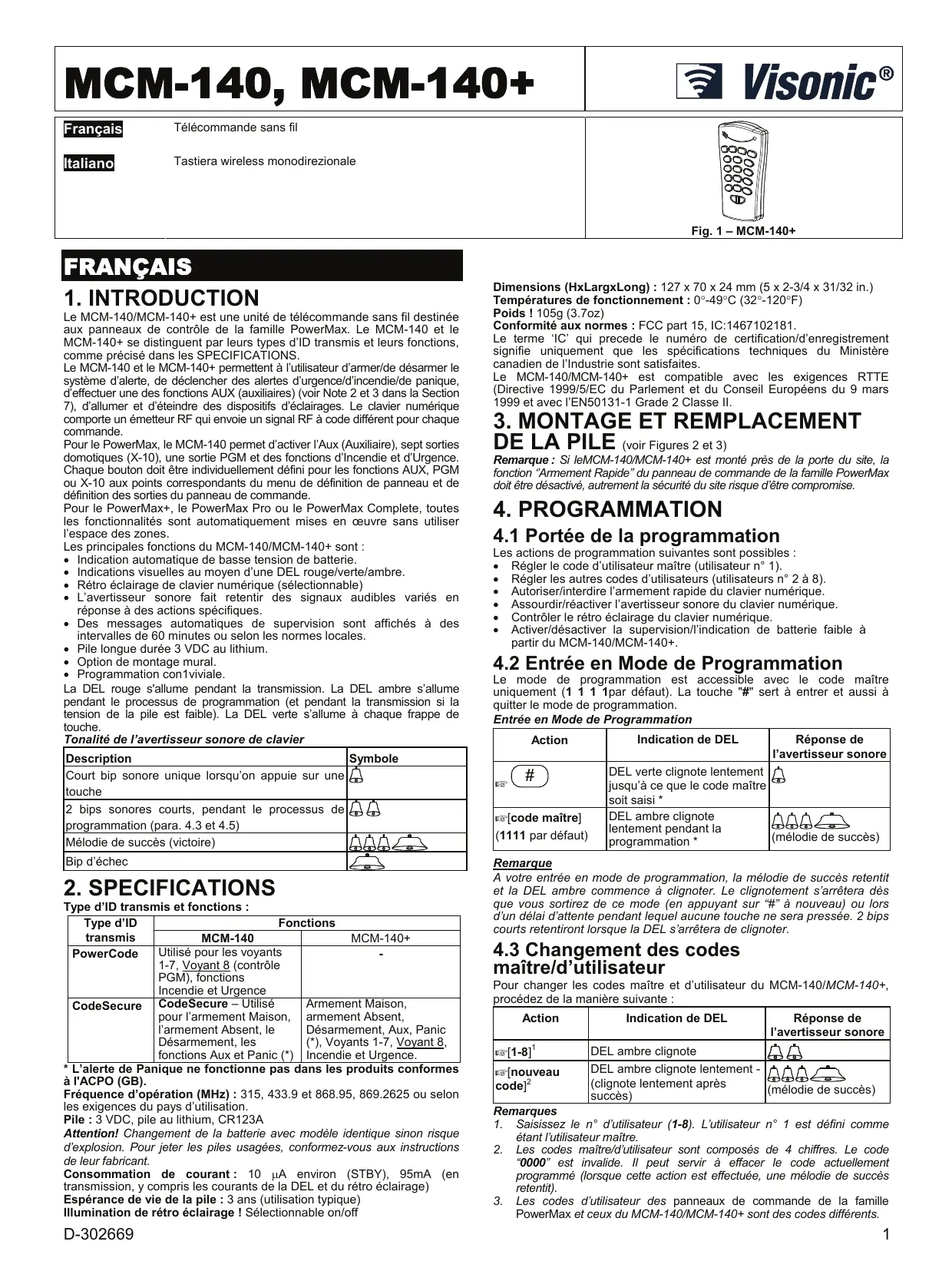 MODE D'EMPLOI MCM-140PLUS VISONIC