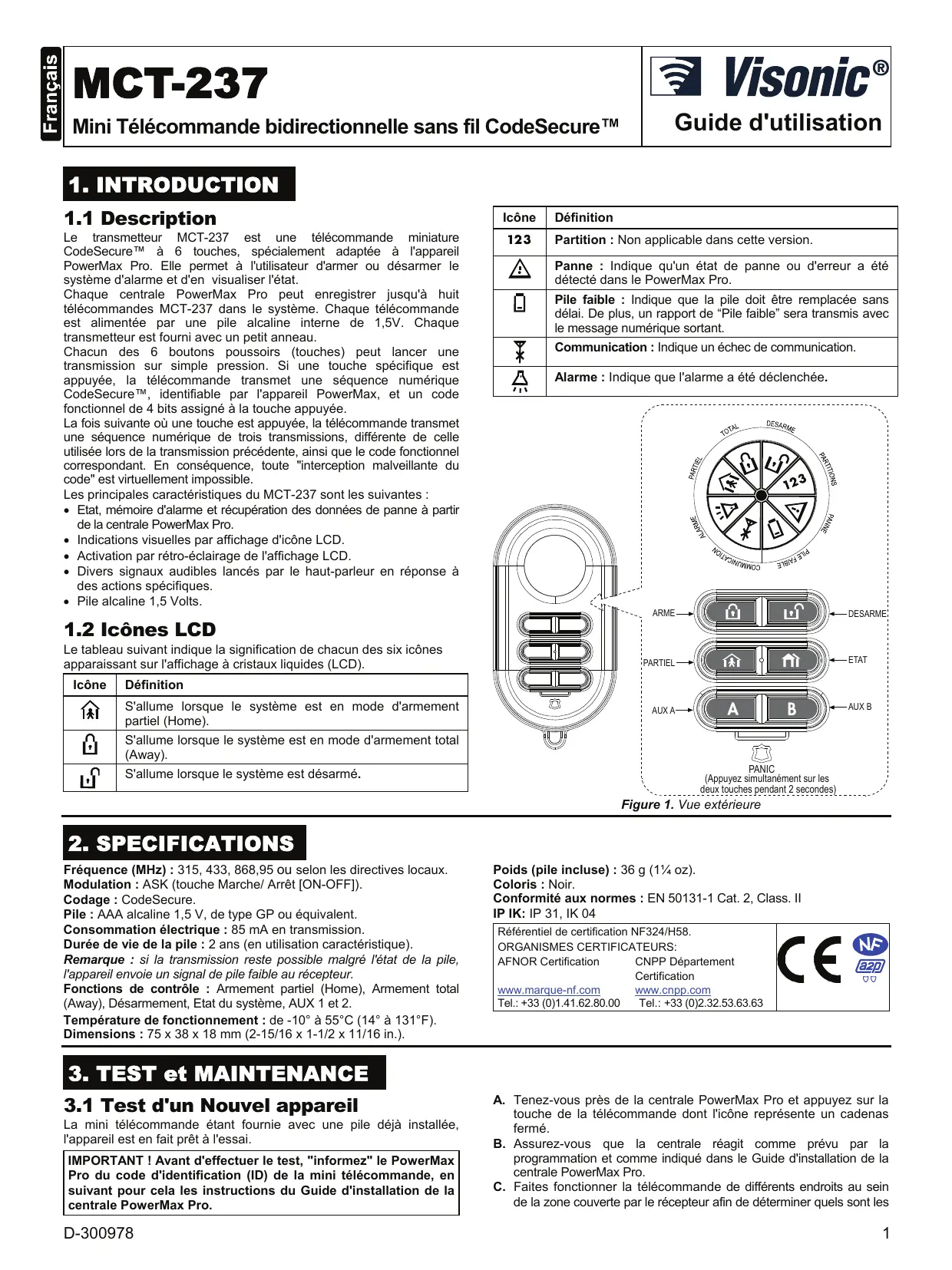 Retrouvez gratuitement la notice de l'appareil MCT-237 VISONIC au format PDF.