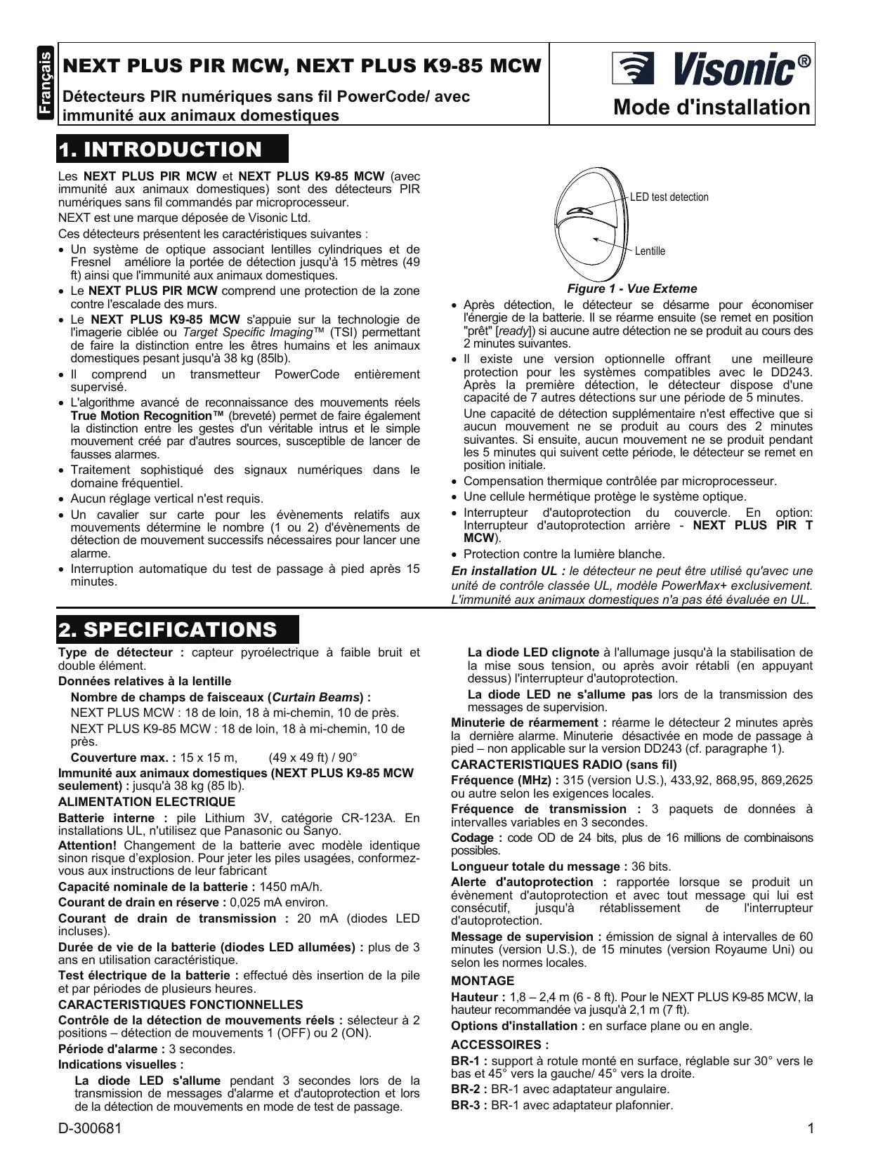 1. INTRODUCTION Les NEXT PLUS PIR MCW et NEXT PLUS K9-85 MCW (avec immunité aux animaux domestiques) sont des détecteurs PIR numériques sans fil commandés par microprocesseur. NEXT est une marque déposée de Visonic Ltd. Ces détecteurs présentent les caractéristiques suivantes : • Un système de optique associant lentilles cylindriques et de Fresnel améliore la portée de détection jusqu'à 15 mètres (49 ft) ainsi que l'immunité aux animaux domestiques. • Le NEXT PLUS PIR MCW comprend une protection de la zone contre l'escalade des murs. • Le NEXT PLUS K9-85 MCW s'appuie sur la technologie de l'imagerie ciblée ou Target Specific Imaging™ (TSI) permettant de faire la distinction entre les êtres humains et les animaux domestiques pesant jusqu'à 38 kg (85lb). • Il comprend un transmetteur PowerCode entièrement supervisé. • L'algorithme avancé de reconnaissance des mouvements réels True Motion Recognition™ (breveté) permet de faire également la distinction entre les gestes d'un véritable intrus et le simple mouvement créé par d'autres sources, susceptible de lancer de fausses alarmes. • Traitement sophistiqué des signaux numériques dans le domaine fréquentiel. • Aucun réglage vertical n'est requis. • Un cavalier sur carte pour les évènements relatifs aux mouvements détermine le nombre (1 ou 2) d'évènements de détection de mouvement successifs nécessaires pour lancer une alarme. • Interruption automatique du test de passage à pied après 15 minutes.
