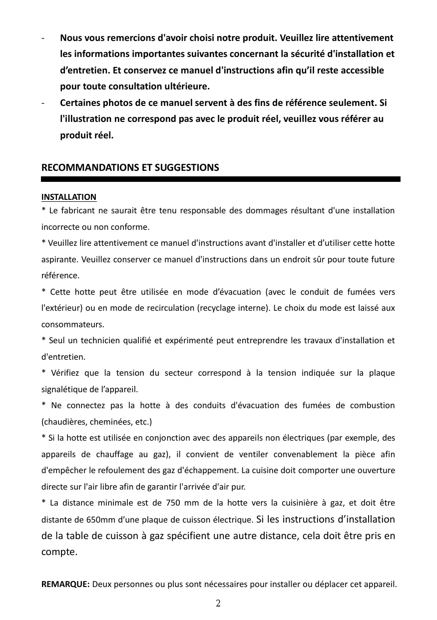 • La distance minimale est de 750 mm de la hotte vers la cuisinière à gaz, et doit être distante de 650mm d’une plaque de cuisson électrique. Si les instructions d’installation de la table de cuisson à gaz spécifient une autre distance, cela doit être pris en compte. REMARQUE: Deux personnes ou plus sont nécessaires pour installer ou déplacer cet appareil.