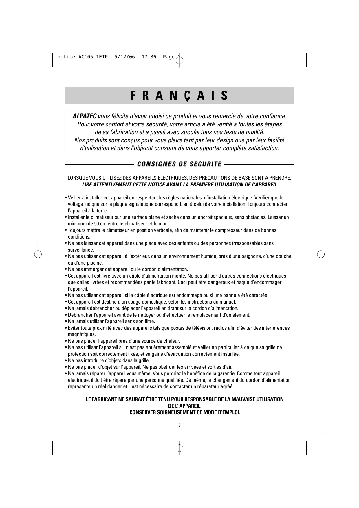 MODE D'EMPLOI AC 105.1 ETP ALPATEC