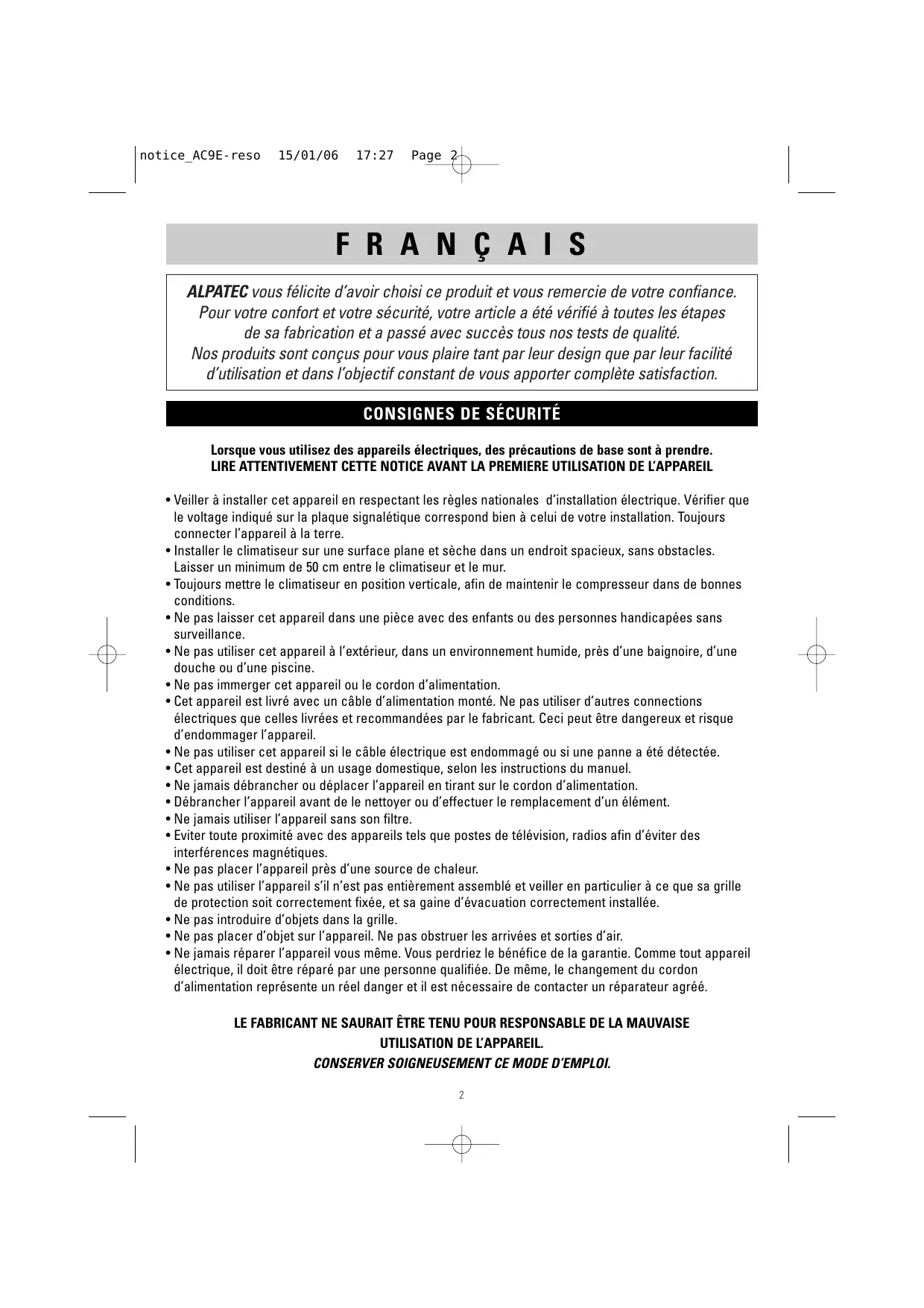 USER MANUAL notice_AC9E-reso 15/01/06 17:27 Page 2 F R A N Ç A I S ALPATEC vous félicite d’avoir choisi ce produit et vous remercie de votre confiance. Pour votre confort et votre sécurité, votre article a été vérifié à toutes les étapes de sa fabrication et a passé avec succès tous nos tests de qualité. Nos produits sont conçus pour vous plaire tant par leur design que par leur facilité d’utilisation et dans l’objectif constant de vous apporter complète satisfaction.