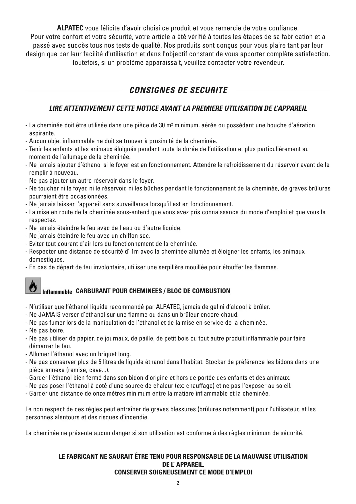 - N’utiliser que l’éthanol liquide recommandé par ALPATEC, jamais de gel ni d’alcool à brûler. - Ne JAMAIS verser d’éthanol sur une flamme ou dans un brûleur encore chaud. - Ne pas fumer lors de la manipulation de l'éthanol et de la mise en service de la cheminée. - Ne pas boire. - Ne pas utiliser de papier, de journaux, de paille, de petit bois ou tout autre produit inflammable pour faire démarrer le feu. - Allumer l’éthanol avec un briquet long. - Ne pas conserver plus de 5 litres de liquide éthanol dans l'habitat. Stocker de préférence les bidons dans une pièce annexe (remise, cave...). - Garder l'éthanol bien fermé dans son bidon d’origine et hors de portée des enfants et des animaux. - Ne pas poser l'éthanol à coté d'une source de chaleur (ex: chauffage) et ne pas l'exposer au soleil. - Garder une distance de onze mètres minimum entre la matière inflammable et la cheminée. Le non respect de ces règles peut entraîner de graves blessures (brûlures notamment) pour l’utilisateur, et les personnes alentours et des risques d’incendie. La cheminée ne présente aucun danger si son utilisation est conforme à des règles minimum de sécurité. LE FABRICANT NE SAURAIT ÊTRE TENU POUR RESPONSABLE DE LA MAUVAISE UTILISATION DE L’ APPAREIL.