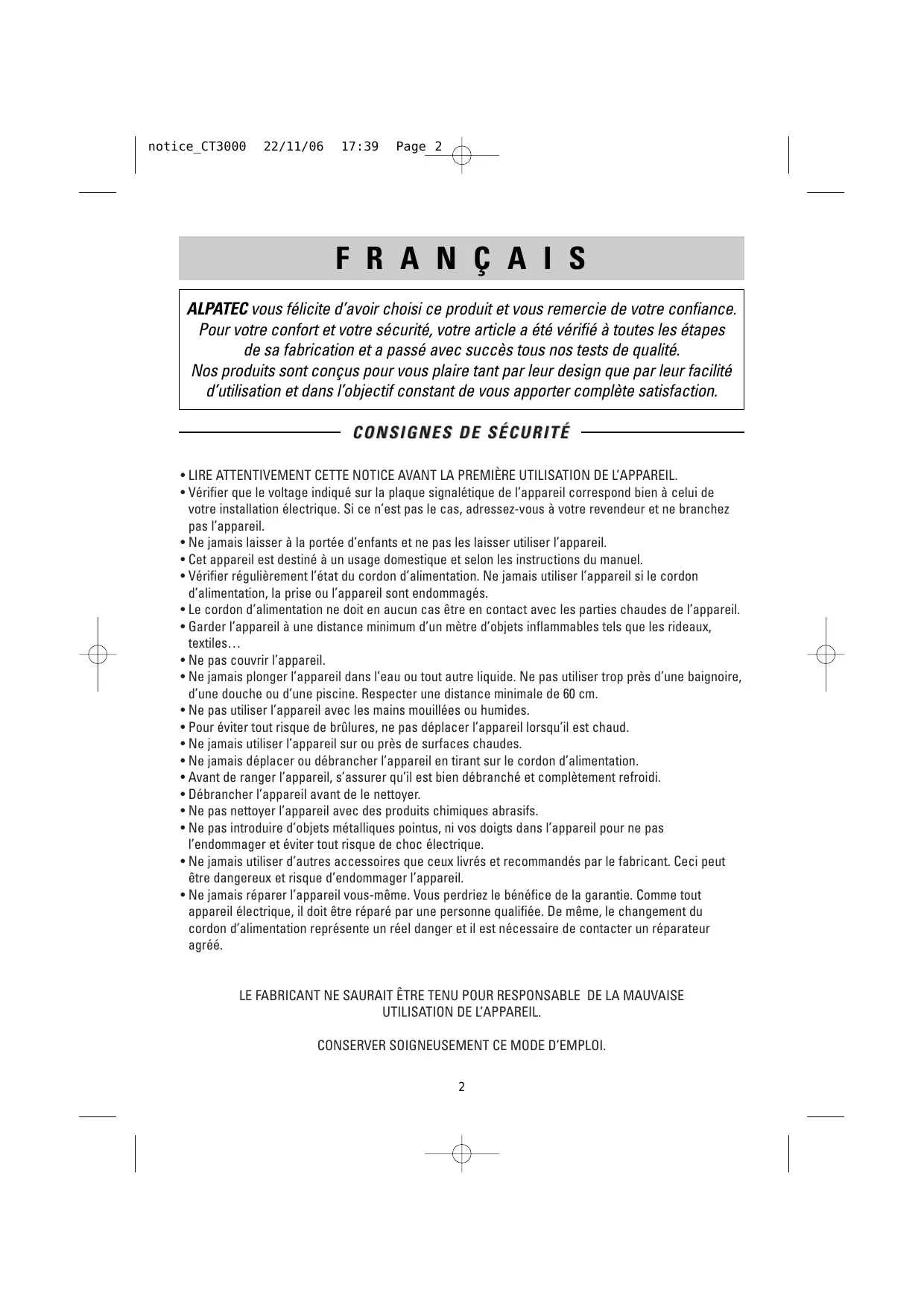 USER MANUAL notice_CT3000 22/11/06 17:39 Page 2 F R A N Ç A I S ALPATEC vous félicite d’avoir choisi ce produit et vous remercie de votre confiance. Pour votre confort et votre sécurité, votre article a été vérifié à toutes les étapes de sa fabrication et a passé avec succès tous nos tests de qualité. Nos produits sont conçus pour vous plaire tant par leur design que par leur facilité d’utilisation et dans l’objectif constant de vous apporter complète satisfaction.