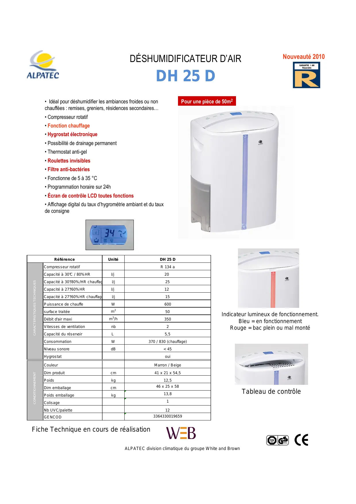 - Filtre anti-bactéries + Fonctionne de 5 à 35 °C + Programmation horaire sur 24h + Écran de contrôle LCD toutes fonctions + Affichage digital du taux d'hygrométrie ambiant et du taux de consigne EN = Référence Unité DH25D Compresseur rotatif R134a _. Capacité à 30T / 80%HR Li] 20 [Capacité à 30780%/HR chauffa: U] 25 = Capacité à 27760%HR Li] 12 (capacité à 27%60%HR chaufag| 1j 15 [Puissance de chauffe W 600 surece ratée me 2 Indicateur lumineux de fonctionnement. Débit d'air maxi Lui 350 Bleu = en fonctionnement Vitesses de ventilation nb 2 Rouge = bac plein ou mal monté Capacité du résenoir L 55 Consommation wW 370 / 830 (chauffage) Niveau sonore dB <45 Hygrostat oui Couleur Marron / Beige Dim produit em 41x21%x54,5 Poids kg 12,5 Dim emballage cm A6x25x58 à Bois nage ko 138 Tableau de contrôle Colisage 1 [Nb UVC/palette 12 GENCOD 336430019659 Fiche Technique en cours de réalisation \V=B ALPATEC division climatique du groupe White and Brown