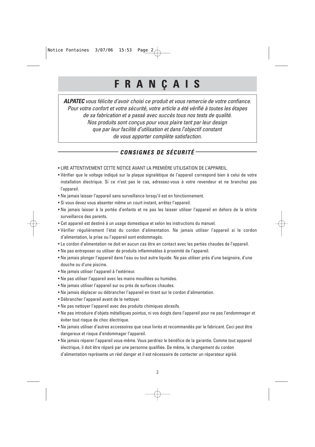 USER MANUAL Notice Fontaines 3/07/06 15:53 Page 2 F R A N Ç A I S ALPATEC vous félicite d’avoir choisi ce produit et vous remercie de votre confiance. Pour votre confort et votre sécurité, votre article a été vérifié à toutes les étapes de sa fabrication et a passé avec succès tous nos tests de qualité. Nos produits sont conçus pour vous plaire tant par leur design que par leur facilité d’utilisation et dans l’objectif constant de vous apporter complète satisfaction.