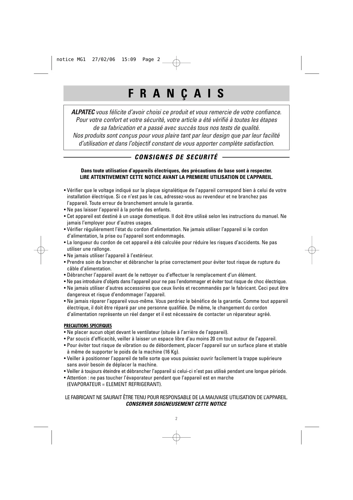 Retrouvez gratuitement la notice de l'appareil MG 1 ALPATEC au format PDF.