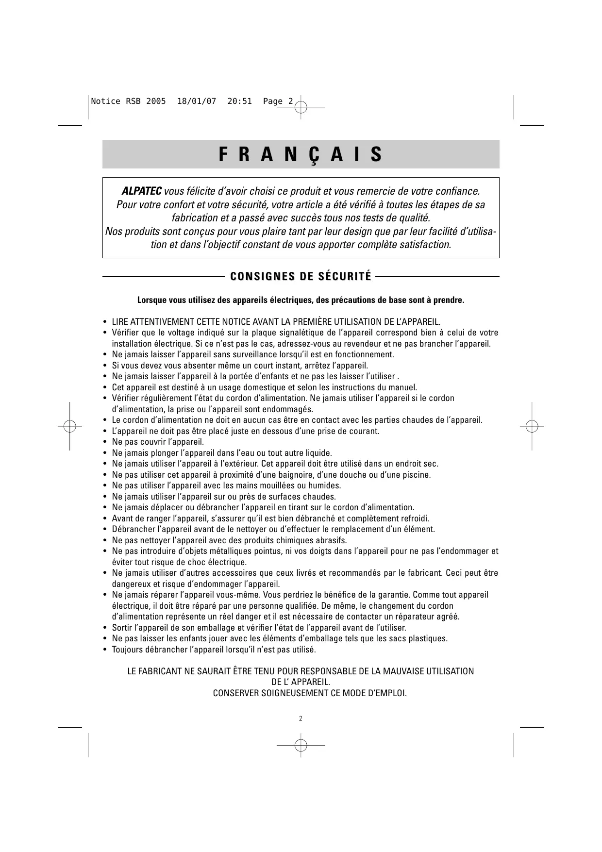 Retrouvez gratuitement la notice de l'appareil RSB 2005 ALPATEC au format PDF.