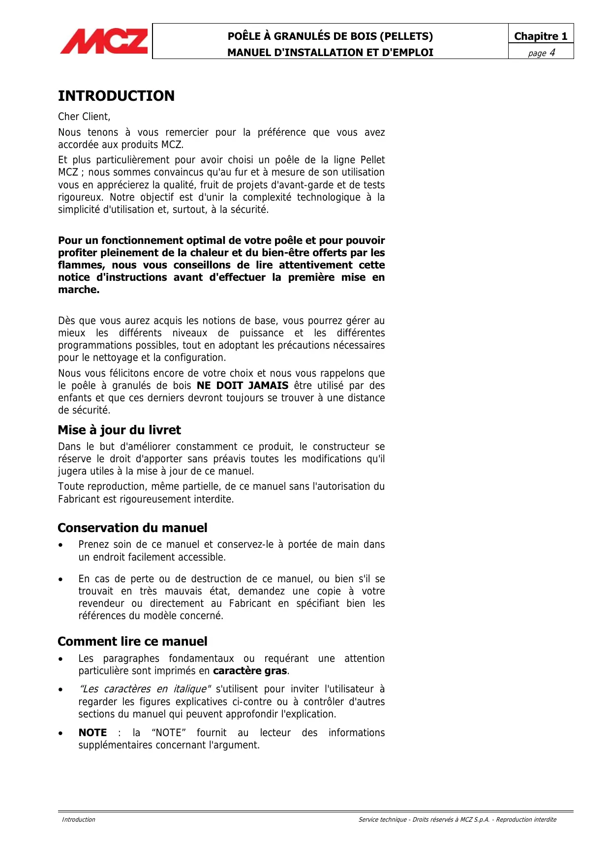 INTRODUCTION Cher Client, Nous tenons à vous remercier pour la préférence que vous avez accordée aux produits MCZ. Et plus particulièrement pour avoir choisi un poêle de la ligne Pellet MCZ ; nous sommes convaincus qu'au fur et à mesure de son utilisation vous en apprécierez la qualité, fruit de projets d'avant-garde et de tests rigoureux. Notre objectif est d'unir la complexité technologique à la simplicité d'utilisation et, surtout, à la sécurité. Pour un fonctionnement optimal de votre poêle et pour pouvoir profiter pleinement de la chaleur et du bien-être offerts par les flammes, nous vous conseillons de lire attentivement cette notice d'instructions avant d'effectuer la première mise en marche. Dès que vous aurez acquis les notions de base, vous pourrez gérer au mieux les différents niveaux de puissance et les différentes programmations possibles, tout en adoptant les précautions nécessaires pour le nettoyage et la configuration. Nous vous félicitons encore de votre choix et nous vous rappelons que le poêle à granulés de bois NE DOIT JAMAIS être utilisé par des enfants et que ces derniers devront toujours se trouver à une distance de sécurité. Mise à jour du livret Dans le but d'améliorer constamment ce produit, le constructeur se réserve le droit d'apporter sans préavis toutes les modifications qu'il jugera utiles à la mise à jour de ce manuel. Toute reproduction, même partielle, de ce manuel sans l'autorisation du Fabricant est rigoureusement interdite. Conservation du manuel
