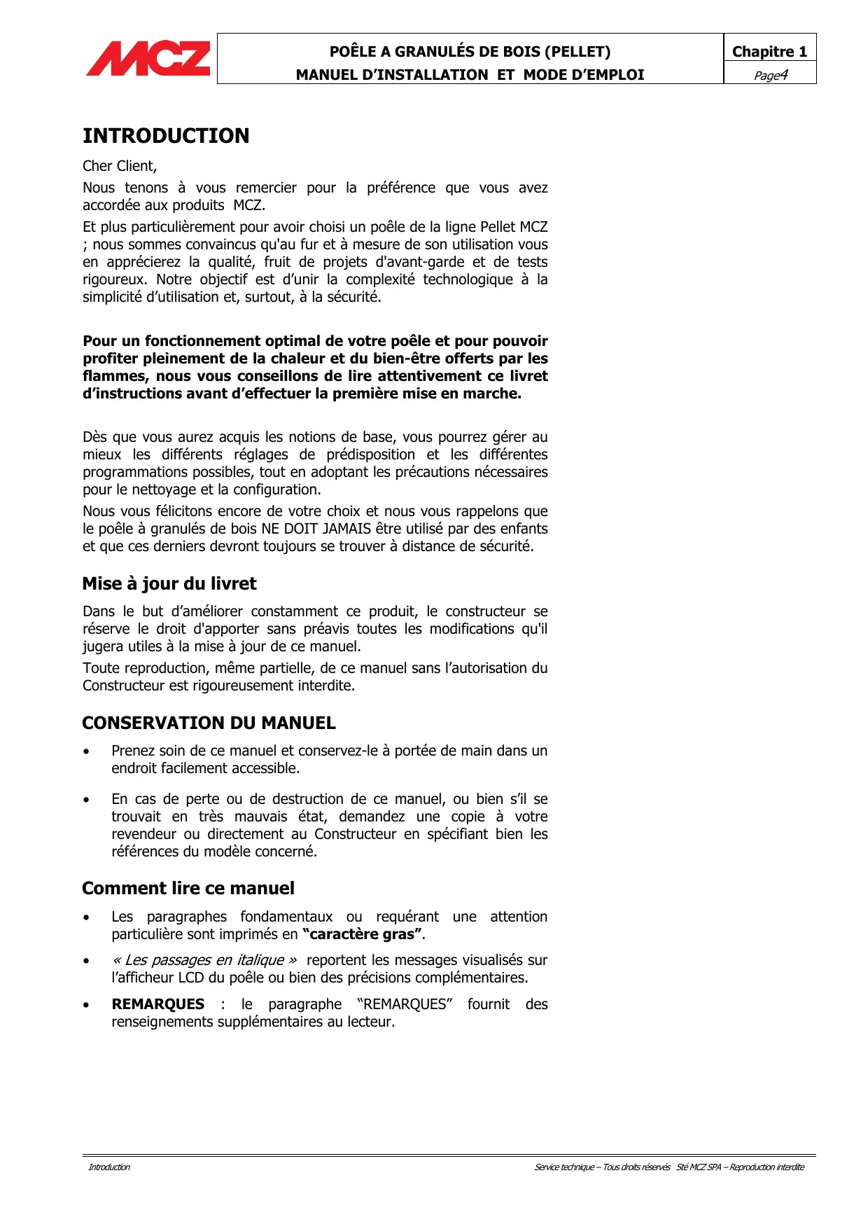 e Prenez soin de ce manuel et conservez-le à portée de main dans un endroit facilement accessible. + En cas de perte ou de destruction de ce manuel, ou bien s'il se trouvait en très mauvais état, demandez une copie à votre revendeur ou directement au Constructeur en spécifiant bien les références du modèle concerné. Comment lire ce manuel e Les paragraphes fondamentaux ou requérant une attention particulière sont imprimés en “caractère gras”. + «Les passages en italique » reportent les messages visualisés sur l'afficheur LCD du poêle ou bien des précisions complémentaires. + REMARQUES : le paragraphe “REMARQUES” fournit des renseignements supplémentaires au lecteur. Introduction Serie technique — Tous drois réservés Sté MCZ SPA - Reproduction interdite